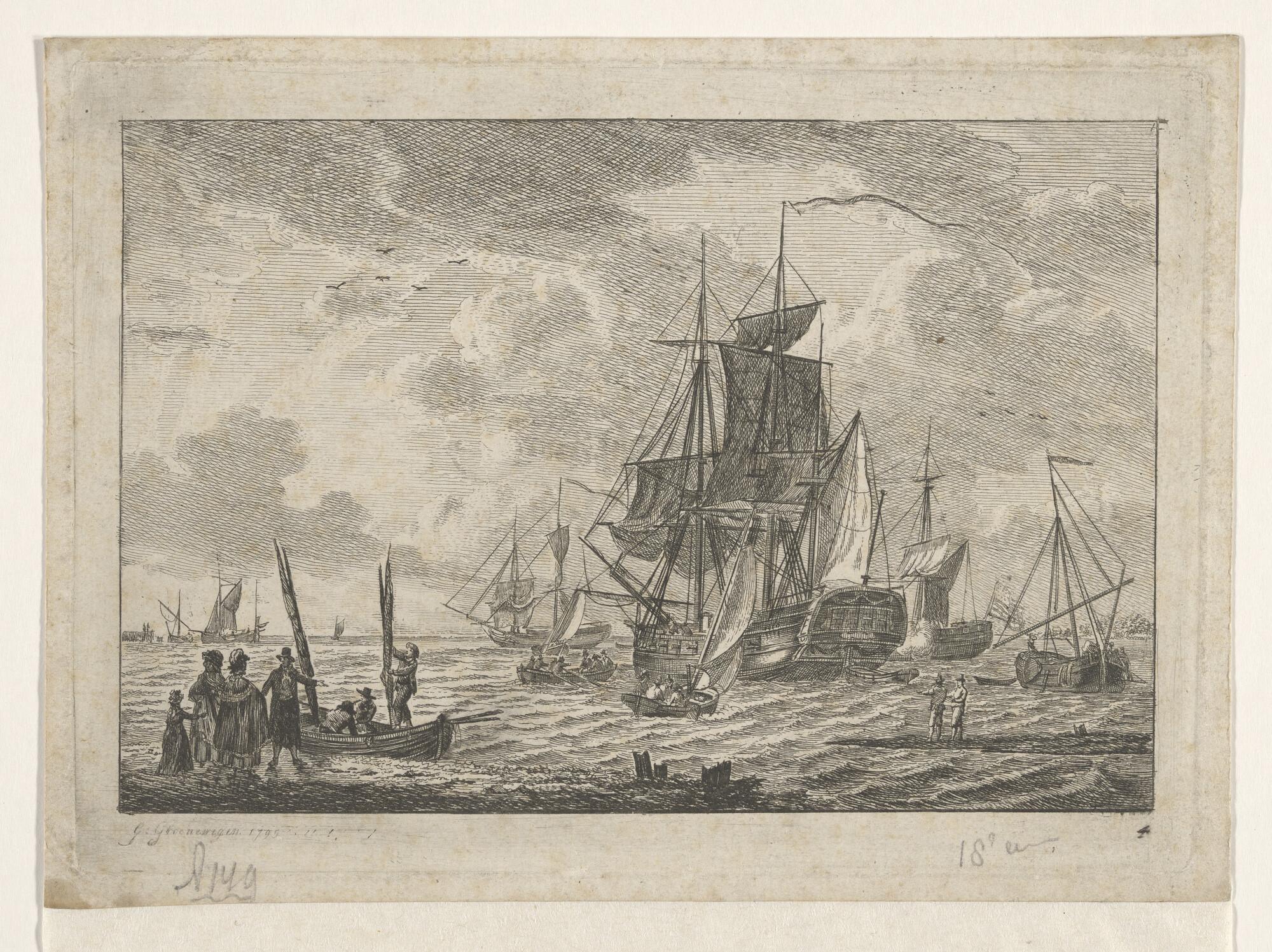 Riviergezicht, met op de voorgrond een fregatschip en enige lichte vaartuigen