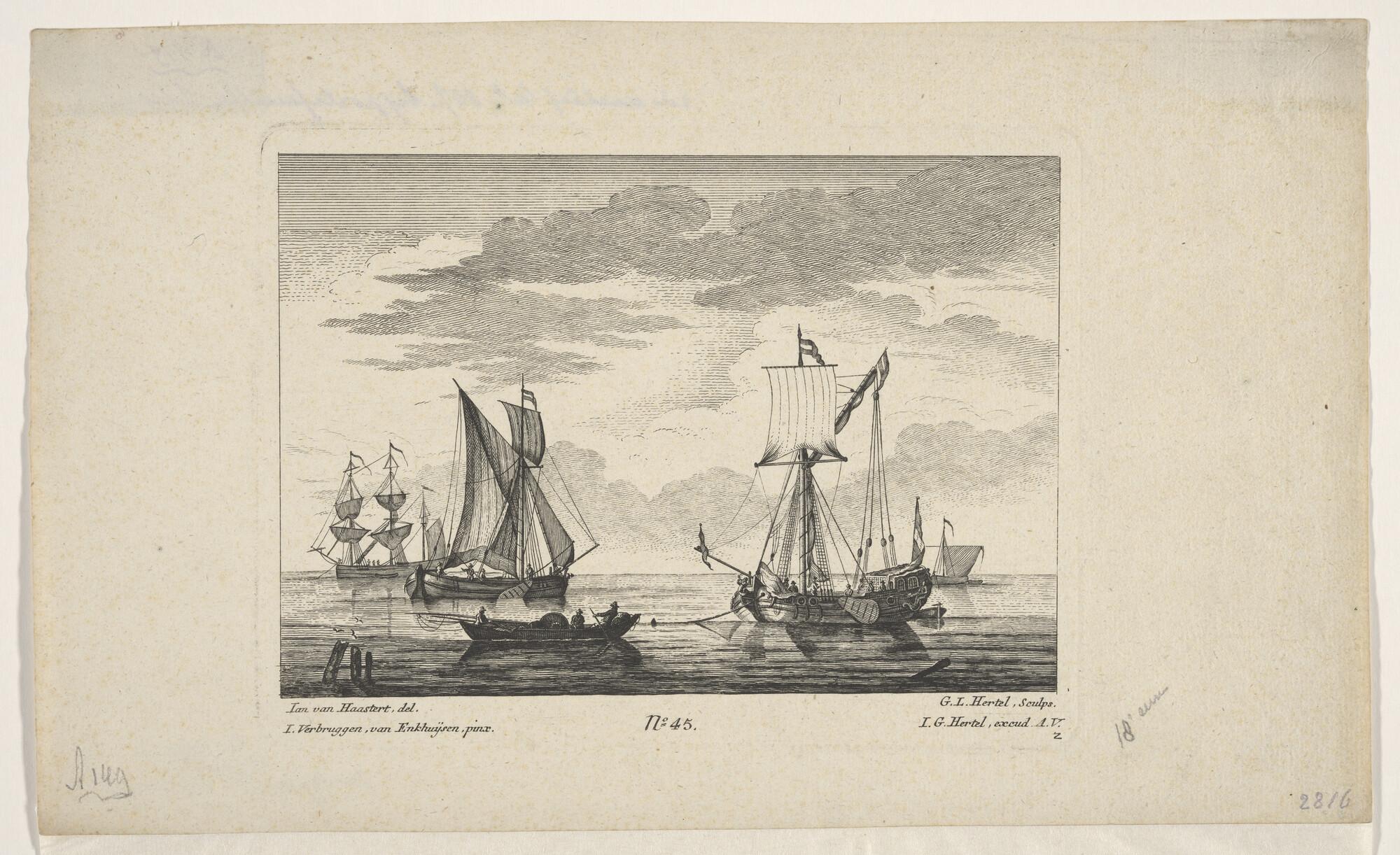 Gezicht op een rede met op de voorgrond een statenjacht, gezien van bakboordzijde en een binnenvaartuig van stuurboordzijde gezien.
