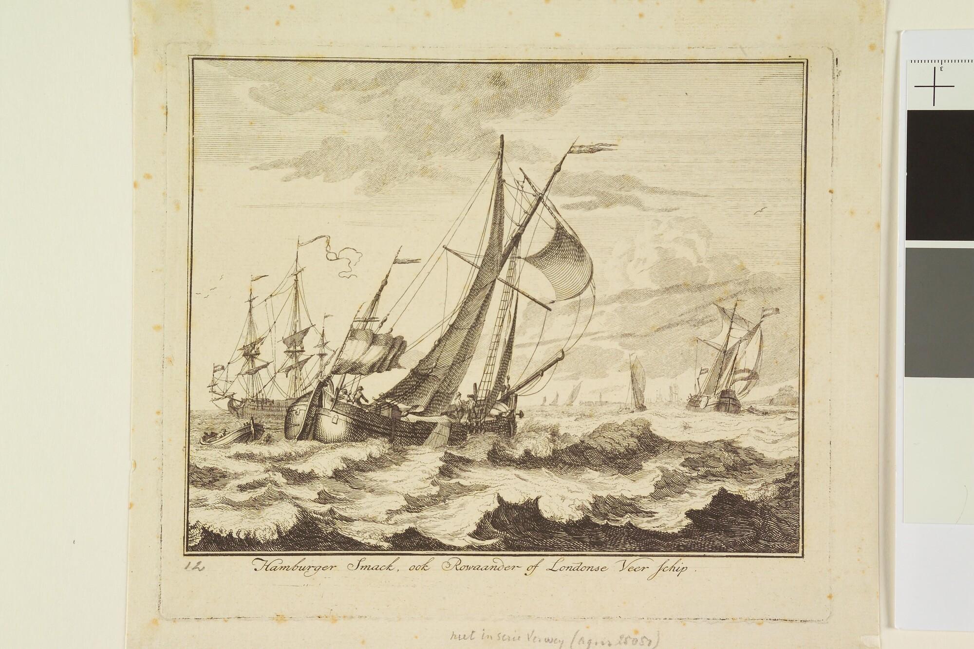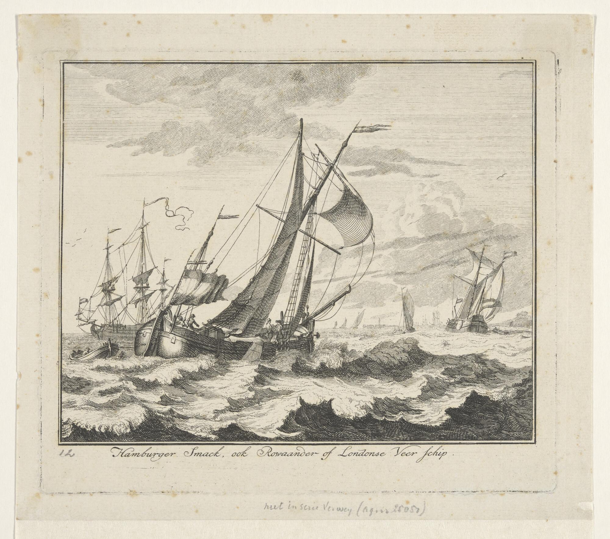 Prent uit een suite van 16 (?) afbeeldingen van in- en uitheemse vaartuigen: een Hamburgse smak, ook wel Rouaans of Londens veerschip genoemd. 'Hamburger Smack.'