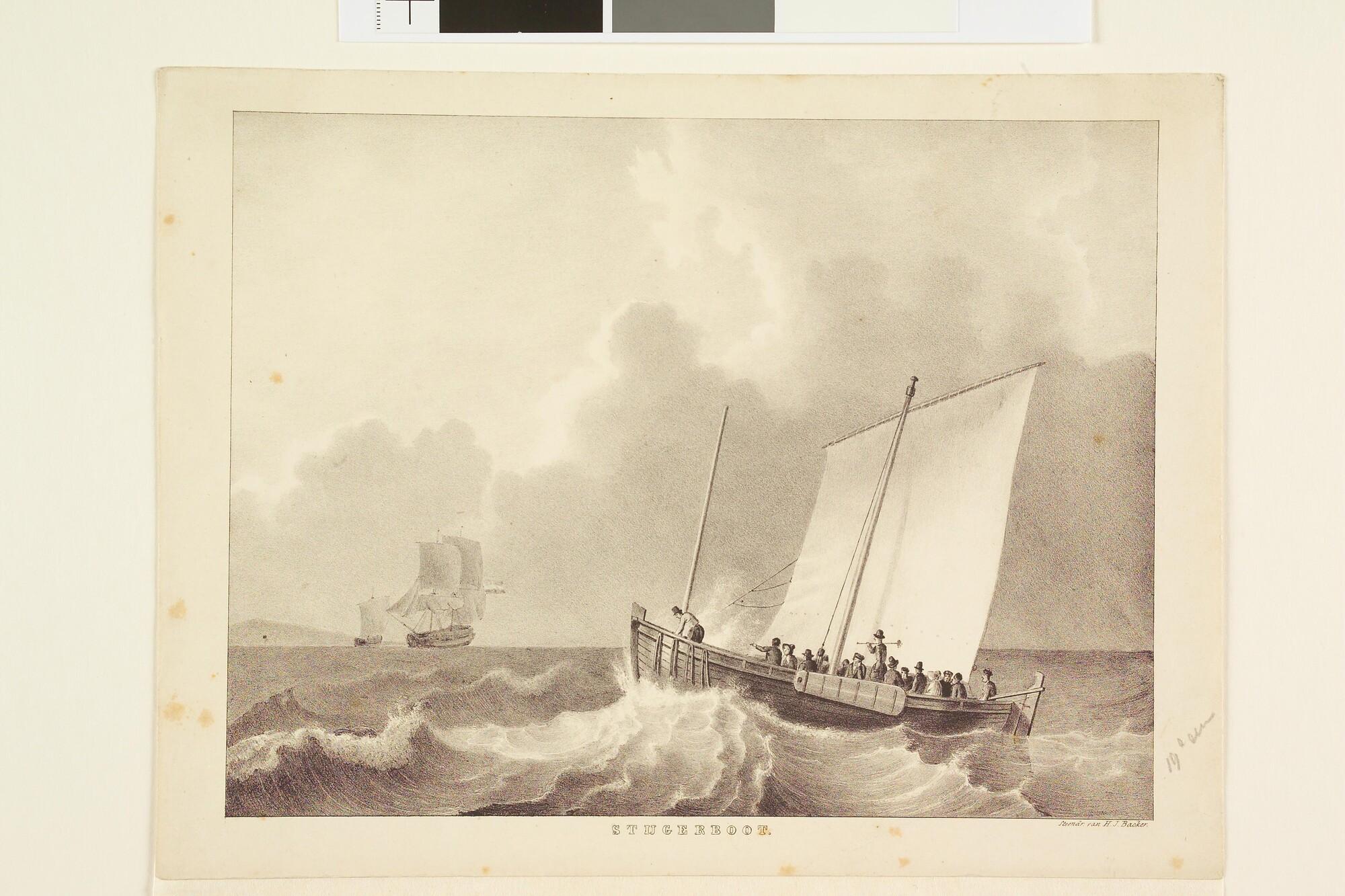 Prent van een stijgerboot, vaartuig voor het verkeer tussen zeeschepen en de wal.