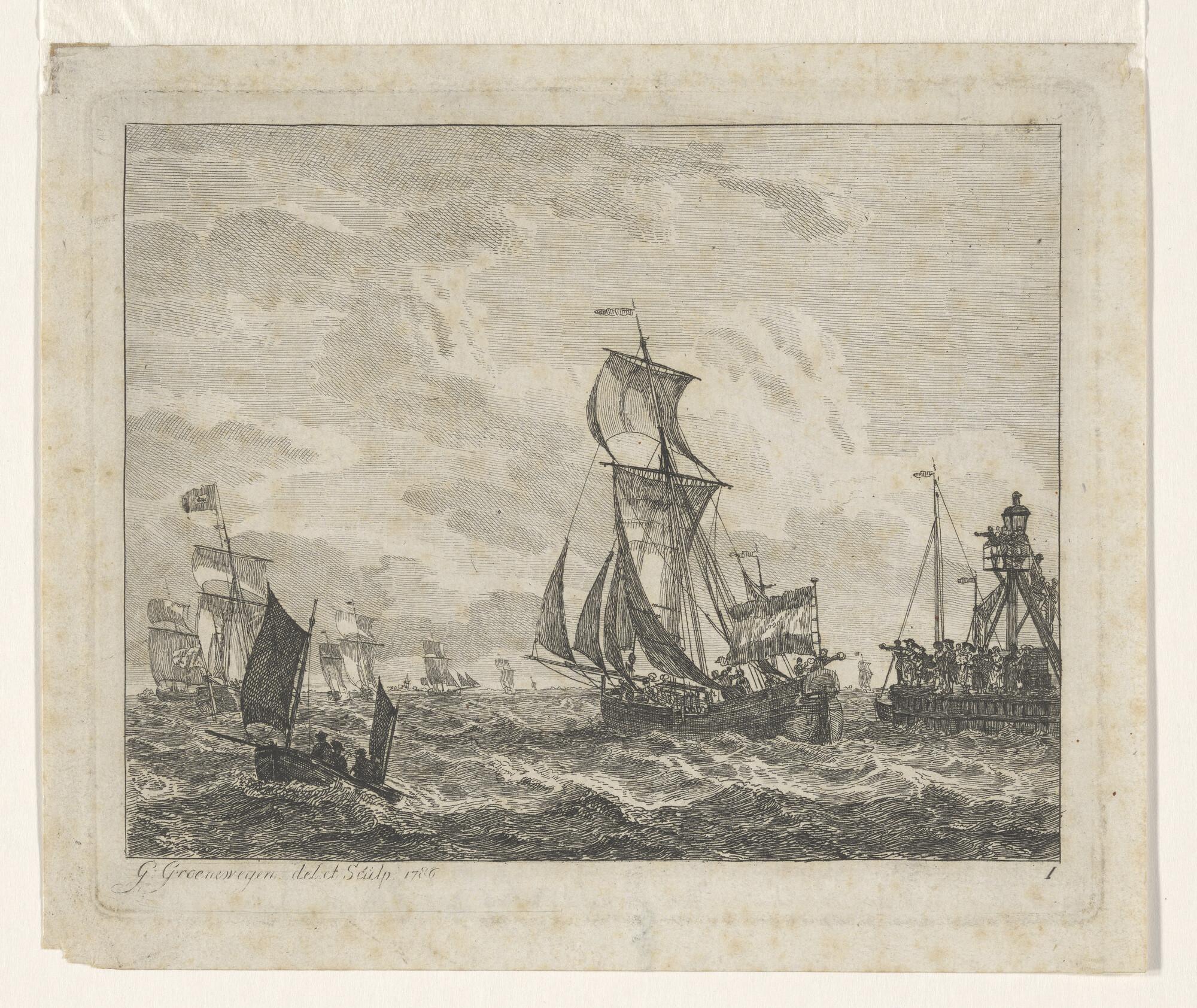 Riviergezicht, op de voorgrond een hoeker de haven verlatende, uitgewuifd