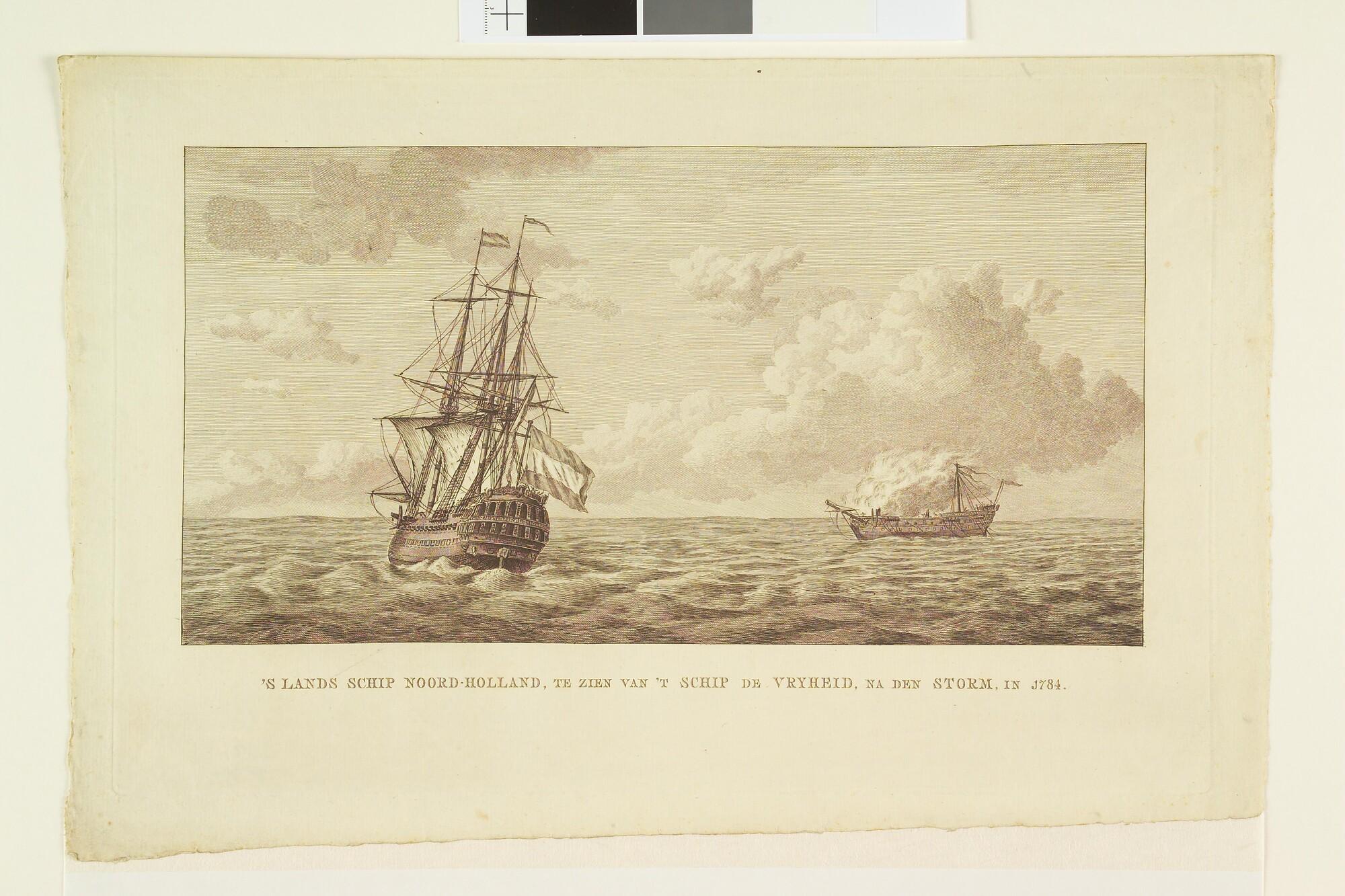 Het oorlogsschip "Noord-Holland" op zee (rechts), brandend en met zware averij; links het oorlogsschip "Vrijheid", na de storm in 1784.
