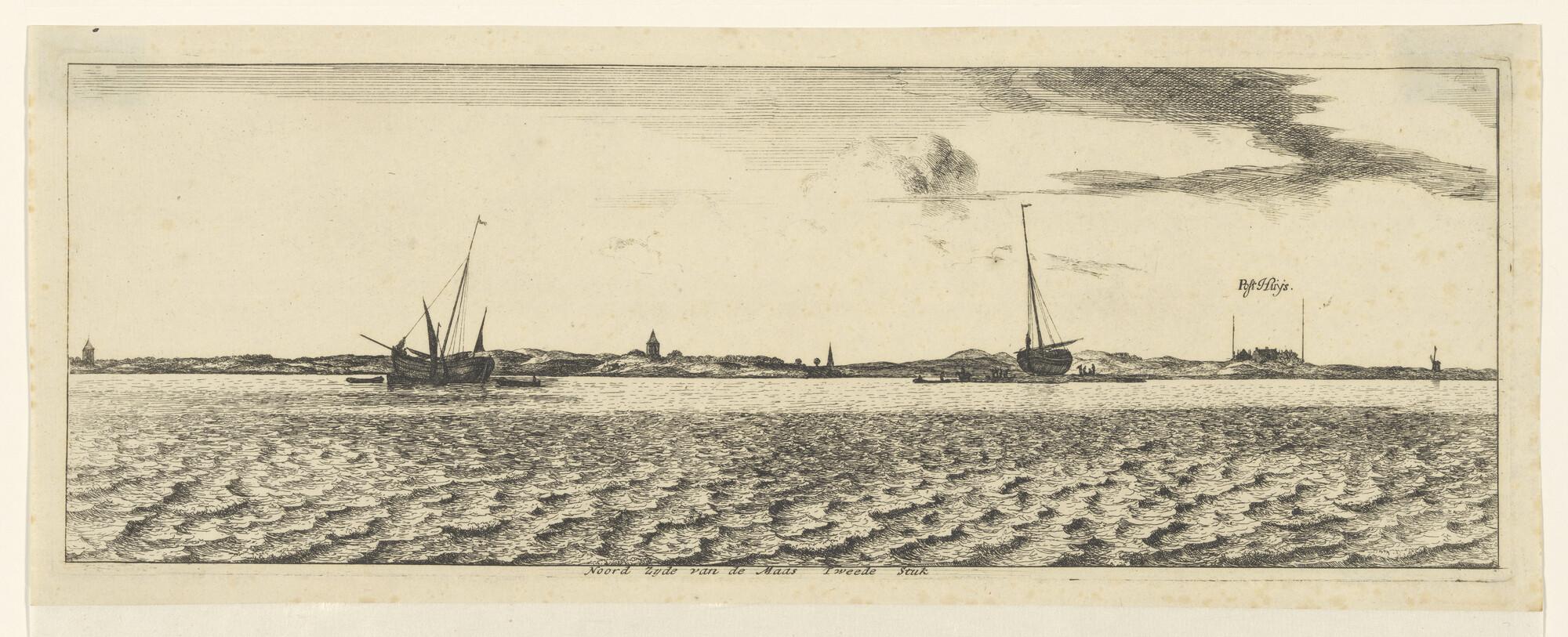 De noordzijde van de Maasmond met uitzicht op het Posthuis onderdeel van de Maaskaart van Jacob Quack; links een smak of Rouaanse boeier.