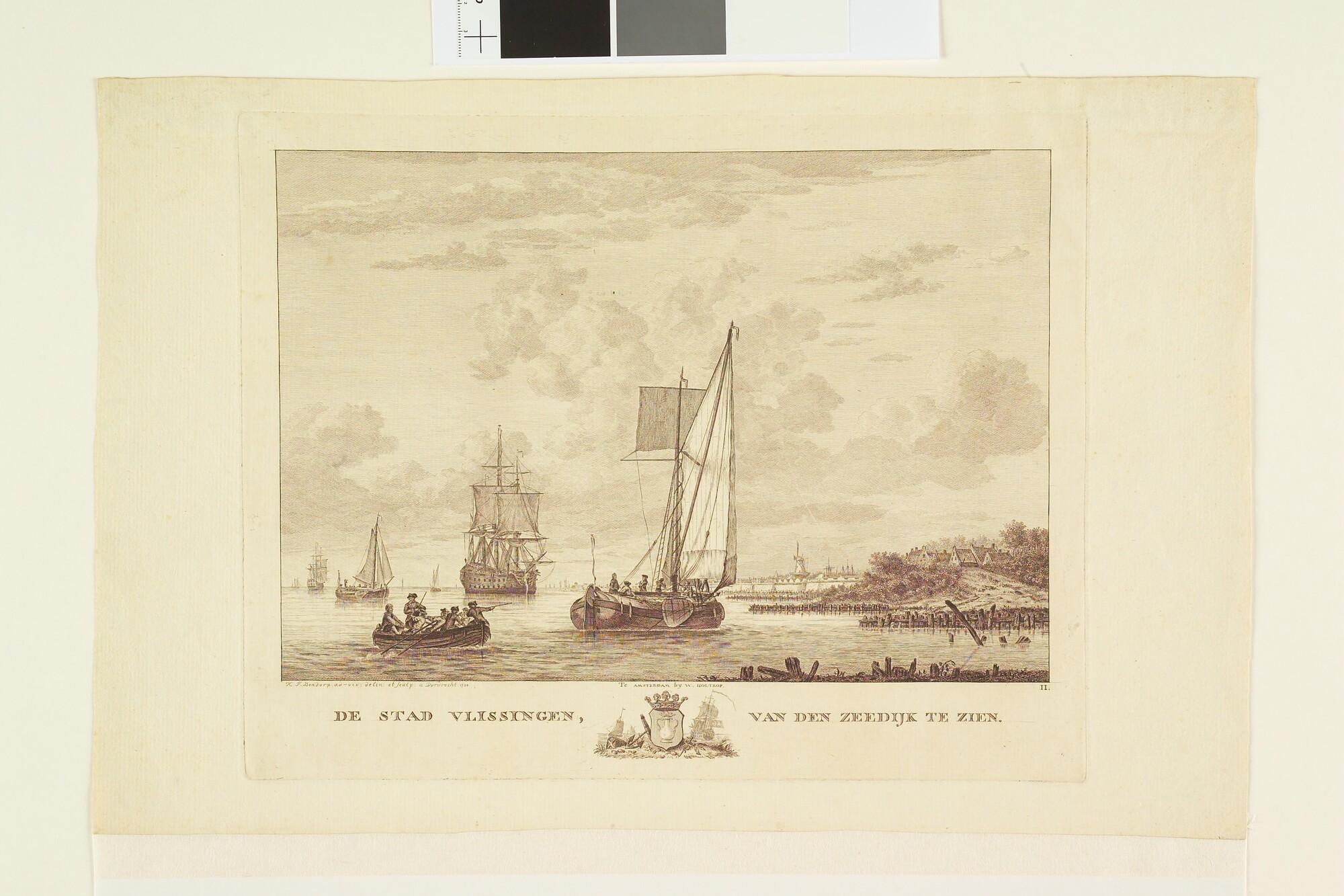 Gezicht op Vlissingen vanaf de zeedijk; onder de afbeelding een vignet met het stadswapen van Vlissingen.