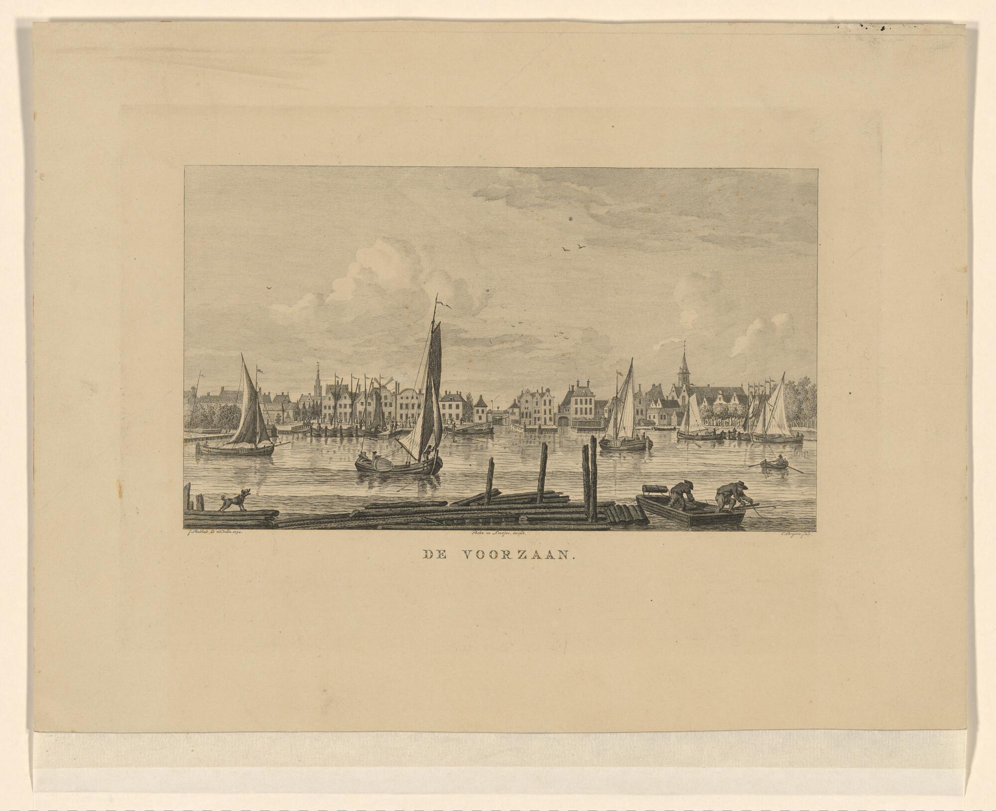 Scheepvaart op d e Voorzaan, op de voorgrond een overzetpontje en een houtvlot.