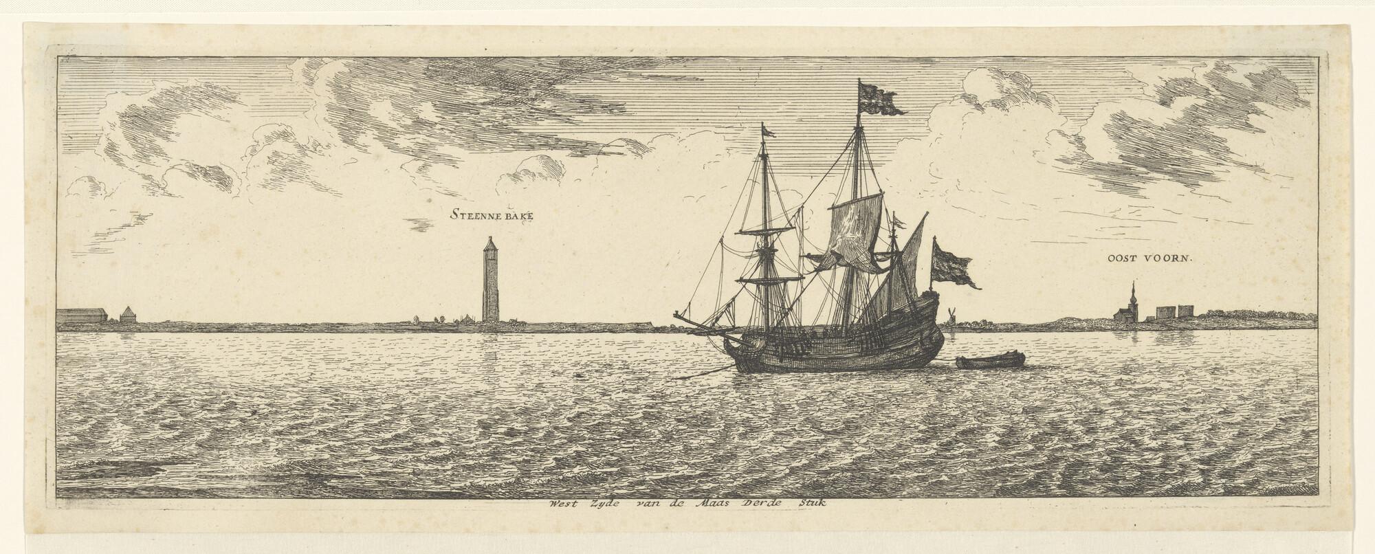 De westzijde van de Maas [derde stuk] met uitzicht op Oostvoorne en Stenen Baken, onderdeel van de Maaskaart van Jacob Quack; rechts van het midden een fluit voor anker.