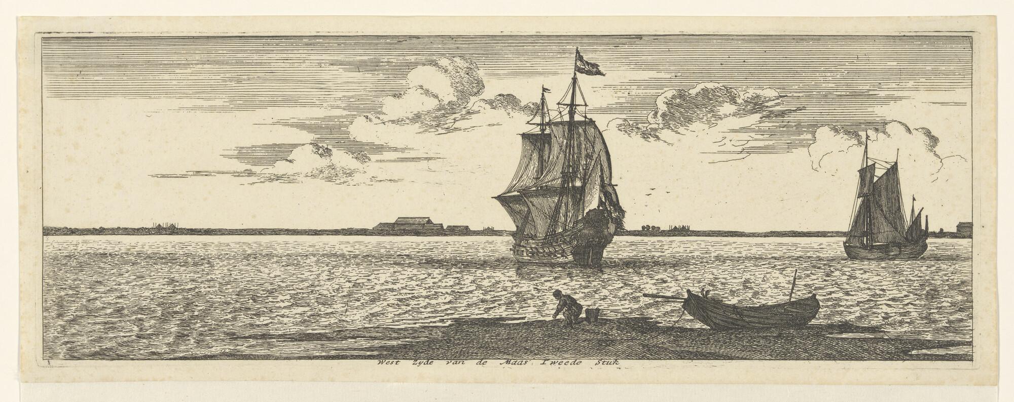 De westzijde van de Maas [tweede stuk], onderdeel van de Maaskaart van Jacob Quack; in het midden een oorlogsschip, rechts een smak.