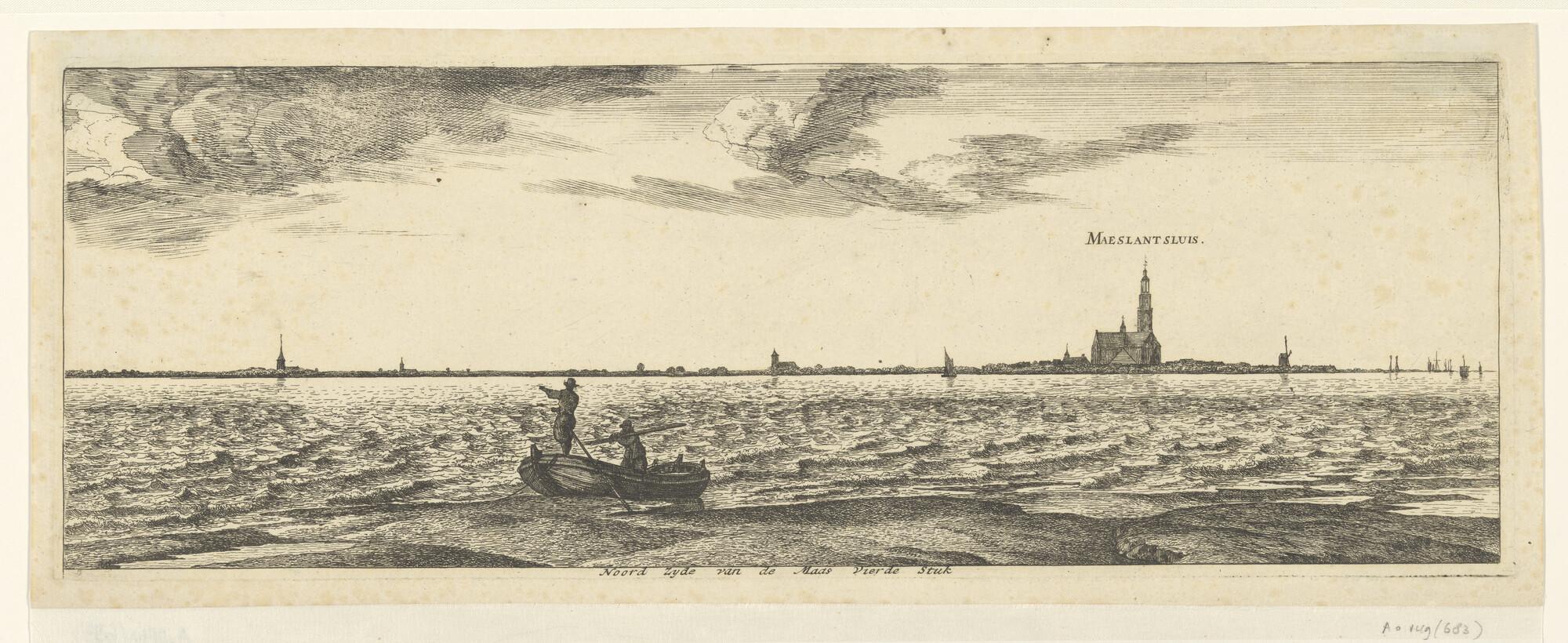 De westzijde van de Maas [vierde stuk] met uitzicht op Den Briel, onderdeel van de Maaskaart van Jacob Quack; op de voorgrond een roeisloep.
