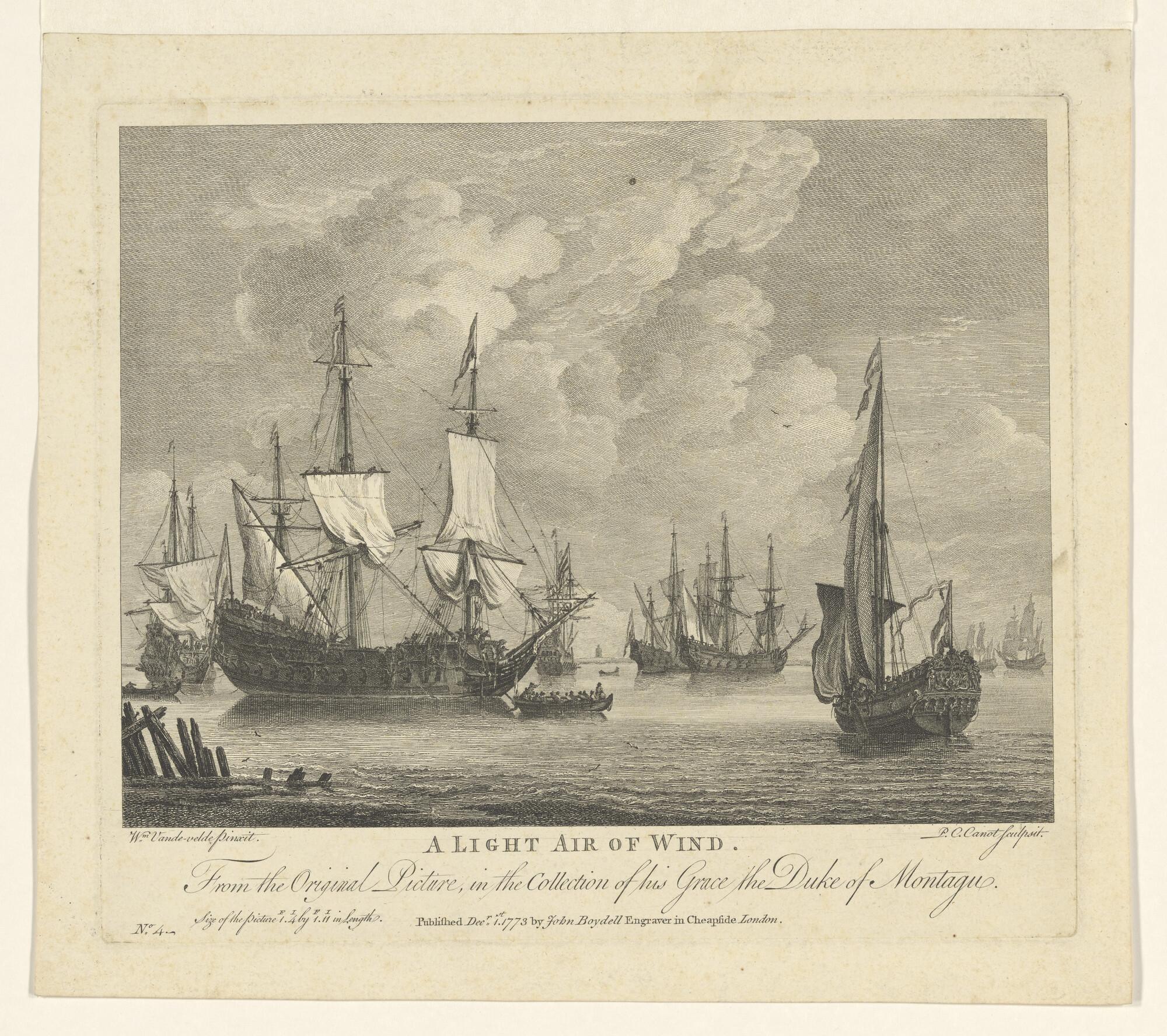 Nederlandse oorlogsschepen en een admiraliteitsjacht op een rede, bij stil weer; prent naar een olieverfschilderij van Willem van de Velde de Jonge.