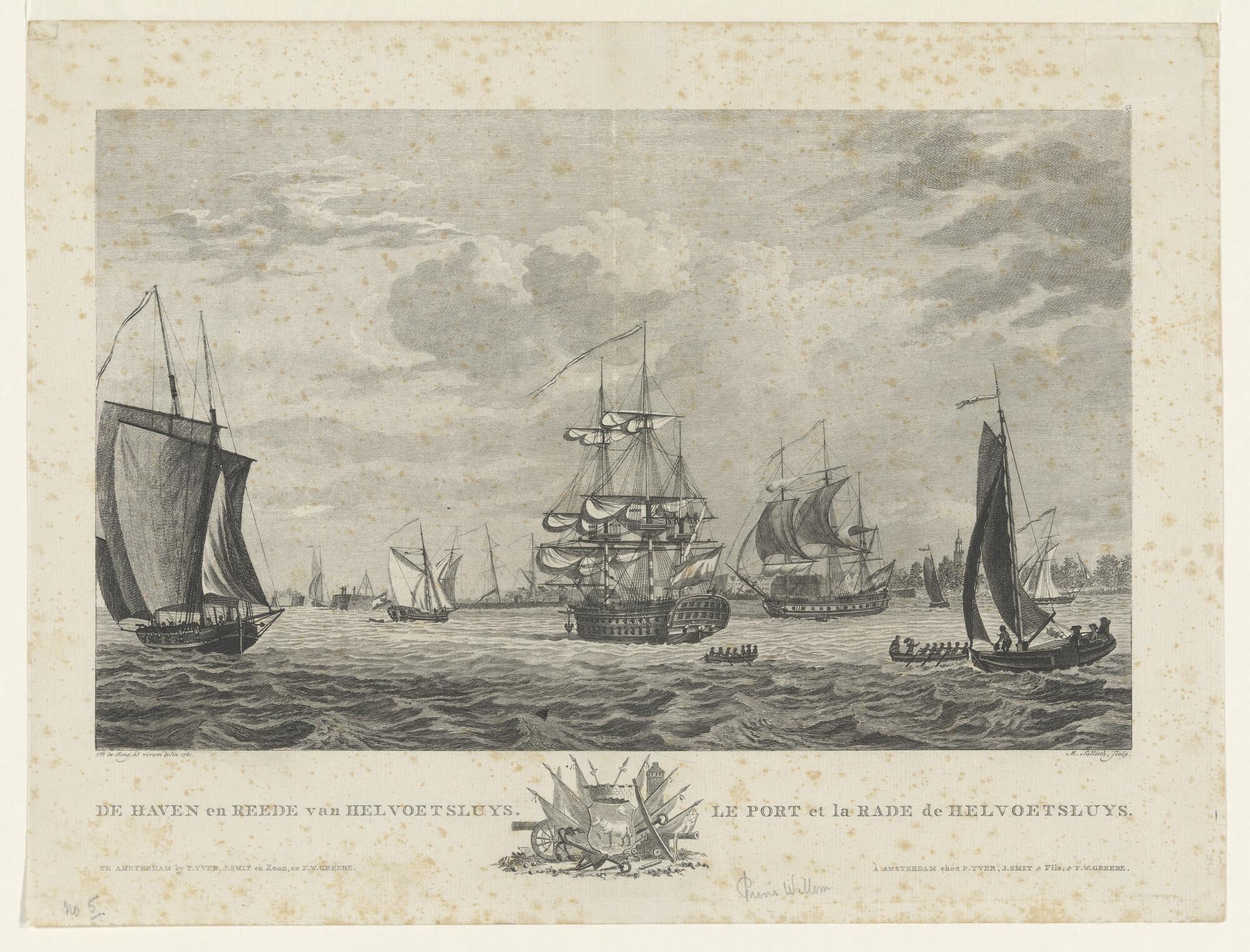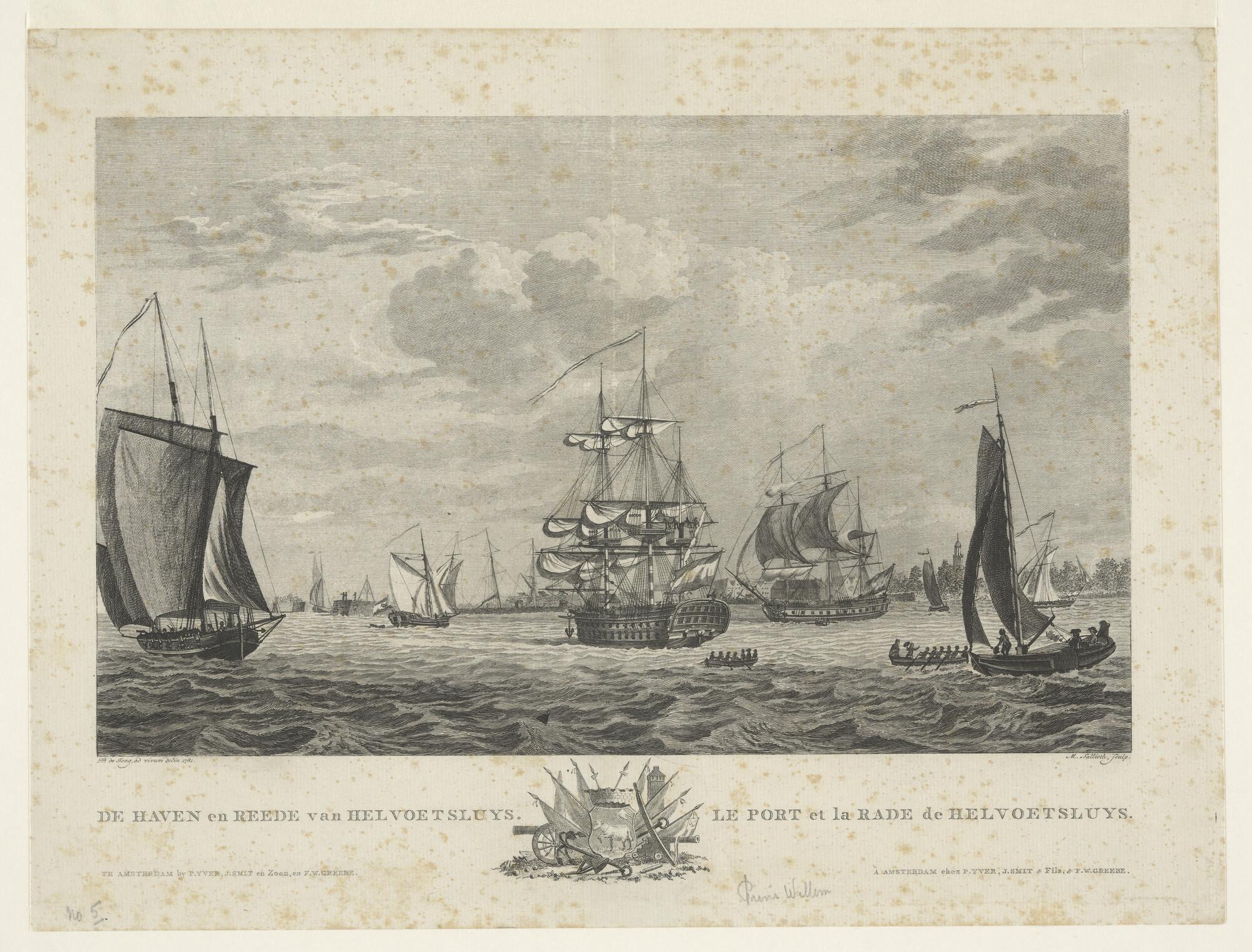 Scheepvaart voor de haven en rede van Hellevoetsluis; in het midden het linieschip 'Prins Willem'