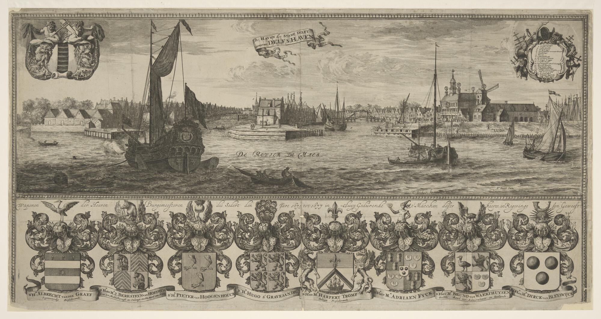Gezicht op Delfshaven van af de Nieuwe Maas; daaronder de familiewapens van de burgemeesters van Delfty, 1675-1677.