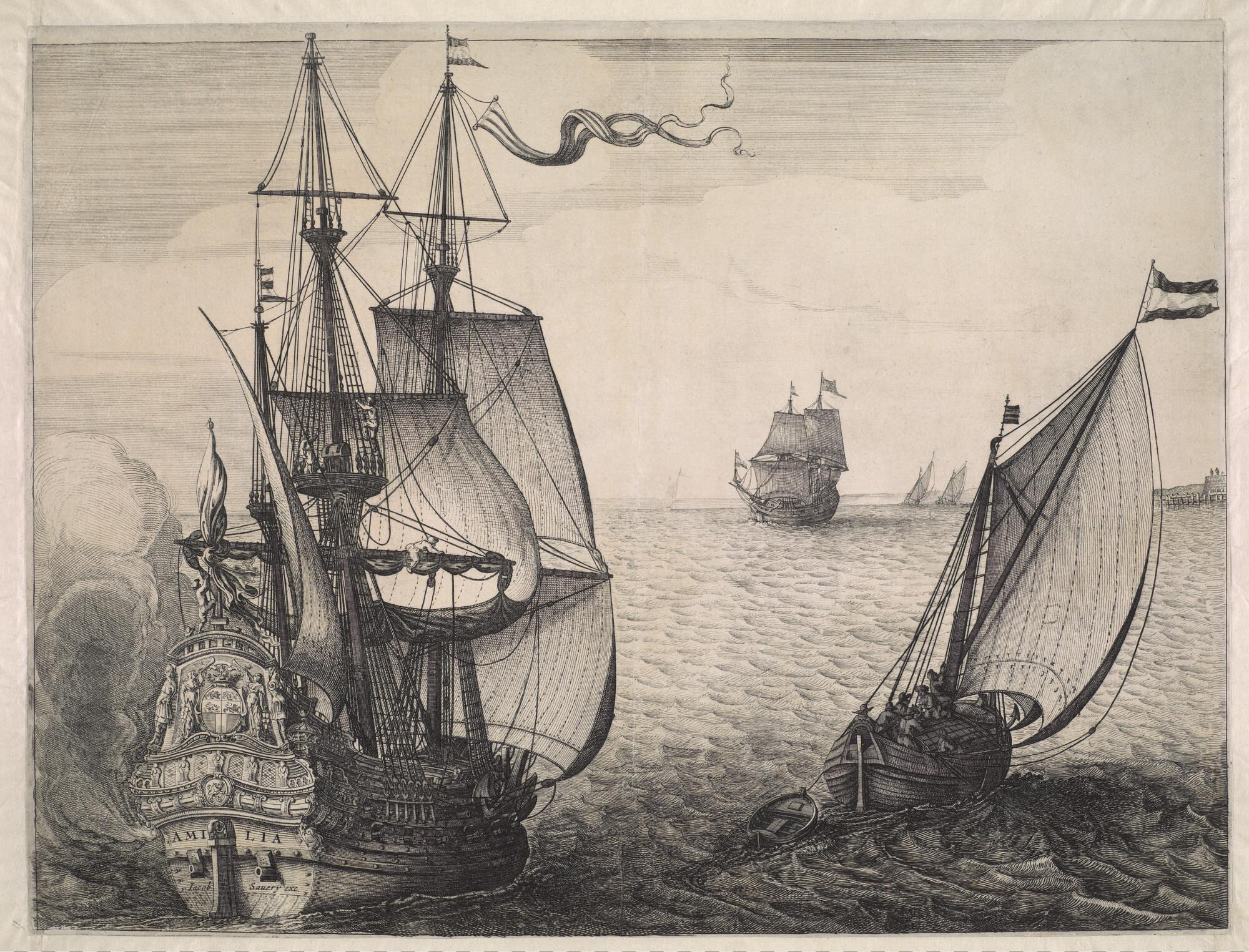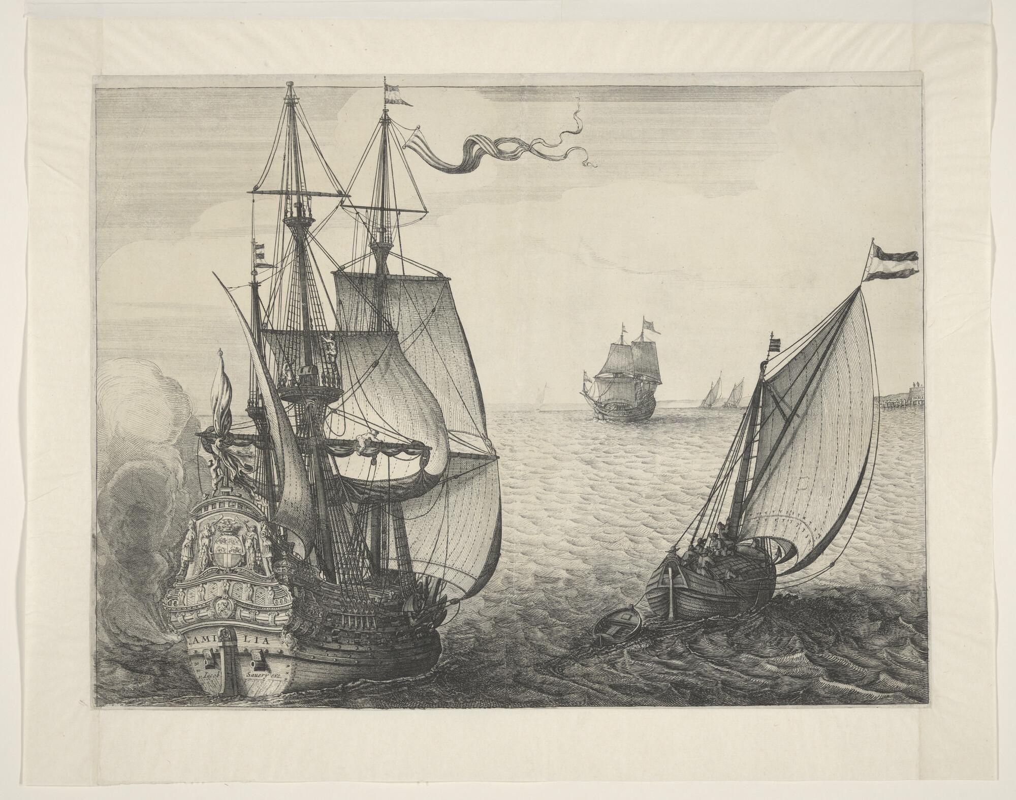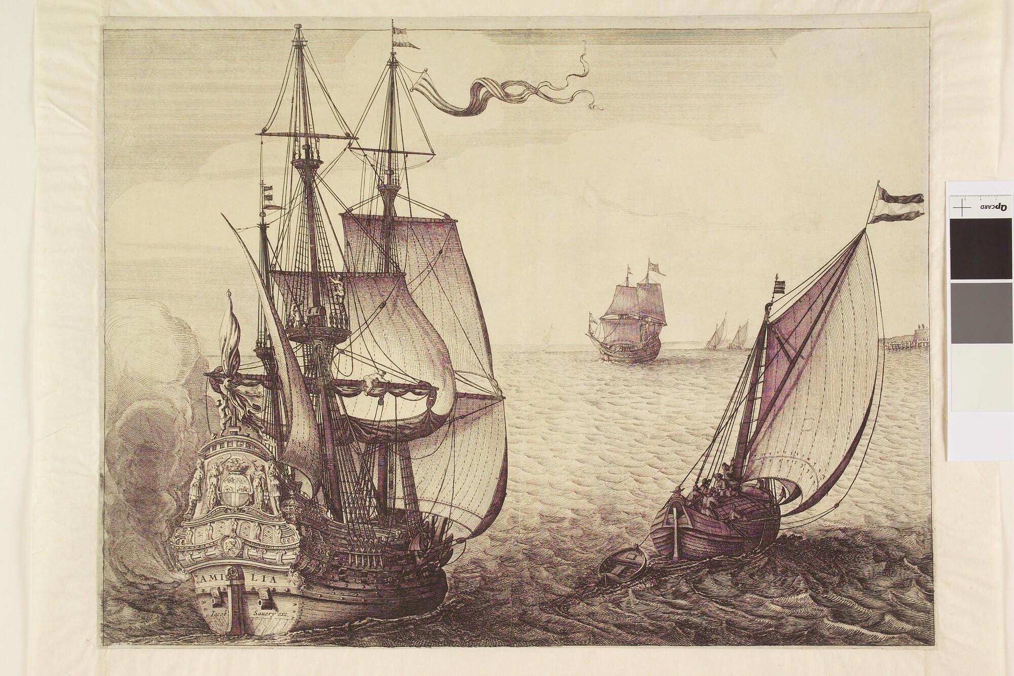 De Aemilia, het admiraalsschip van Maarten Harpertsz Tromp in de Slag bij Duins, op de spiegel het wapen van Rotterdam; rechts een smakschip en andere schepen op de achtergrond