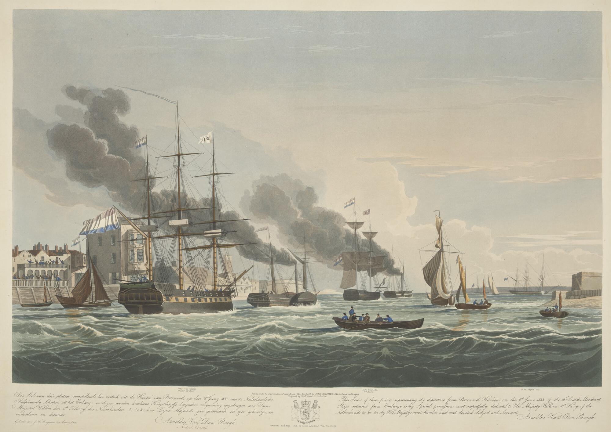Het vertrek uit de haven van Portsmouth na het opheffen van het embargo in 1833 van onder andere de koopvaardijschepen "Prins van Oranje", "Clara Henrietta".