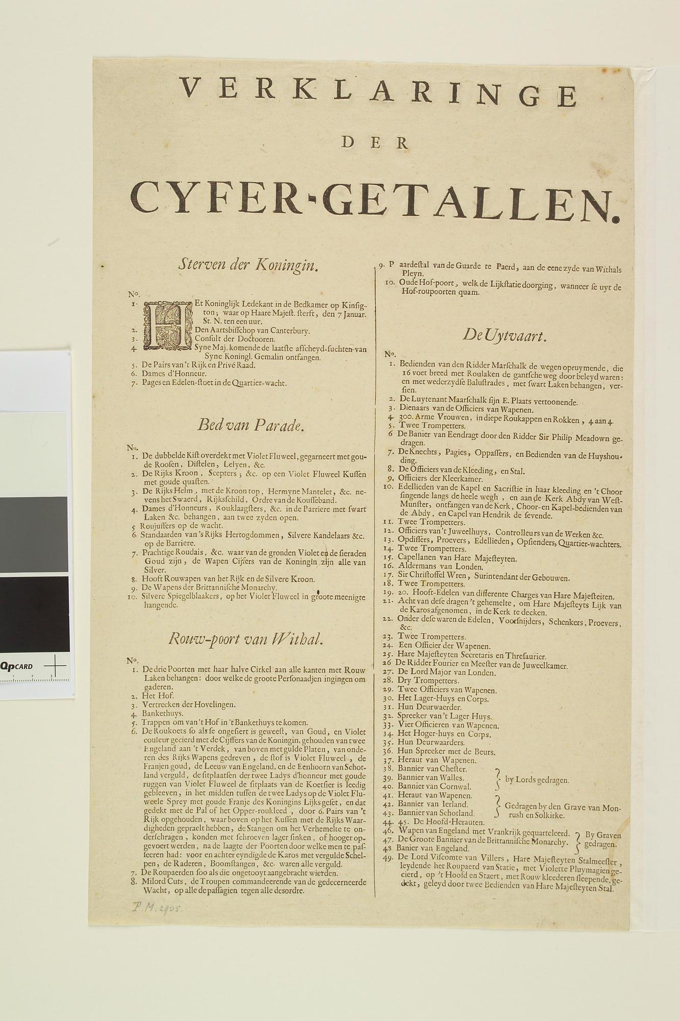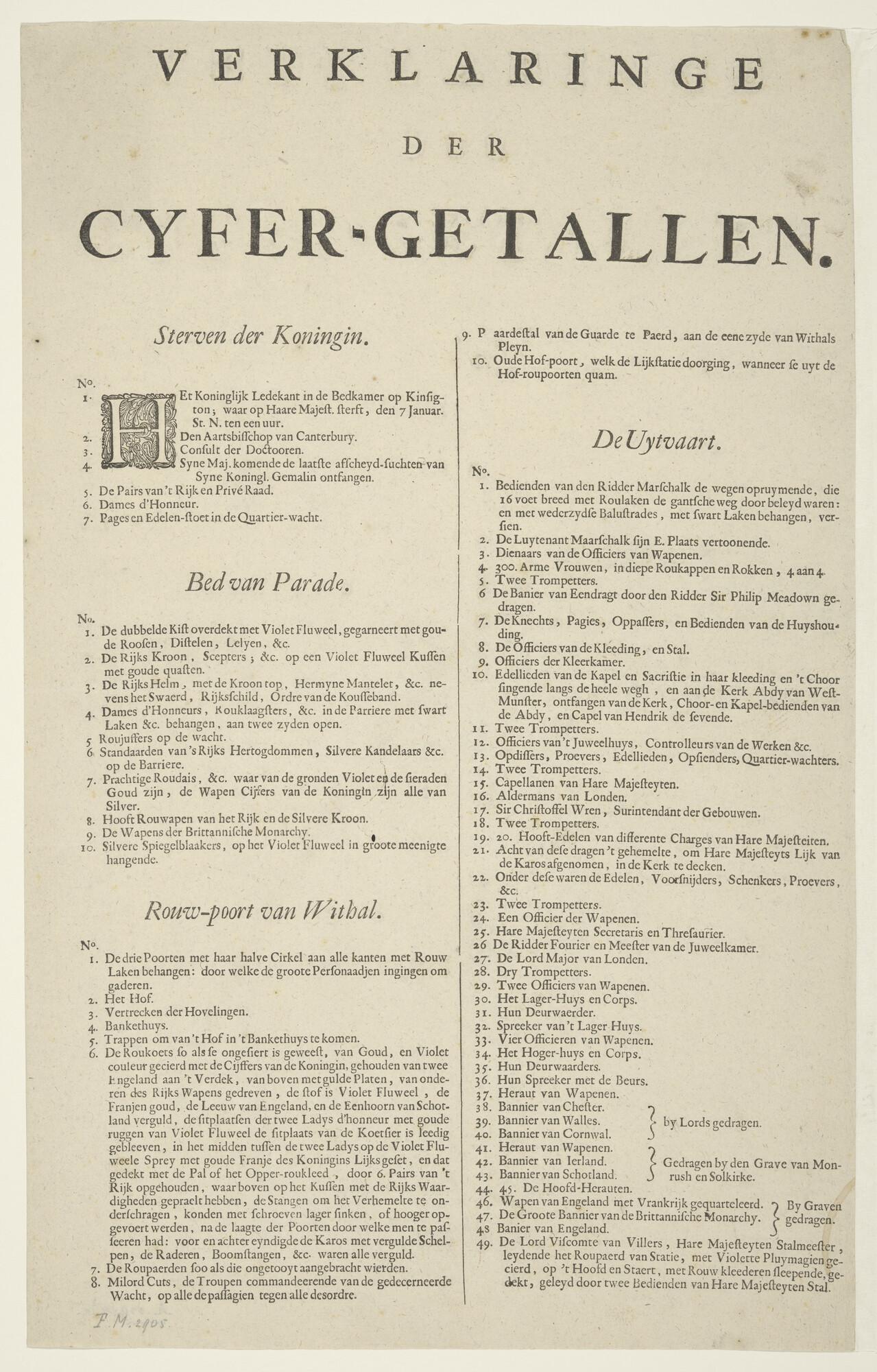 Verklaringe der cyfer-getallen; verklarende lijst bij de platen die dood en lijkstatie verbeelden van de Koningin van Engeland. Pagina 1.
