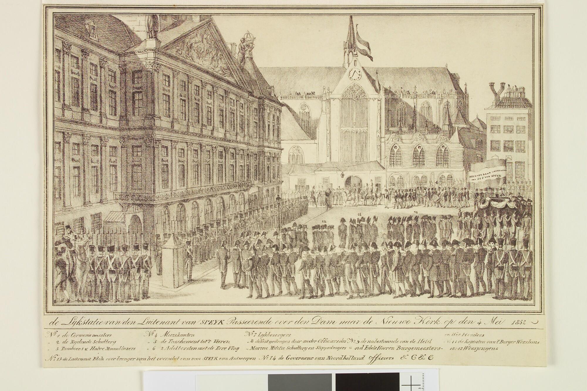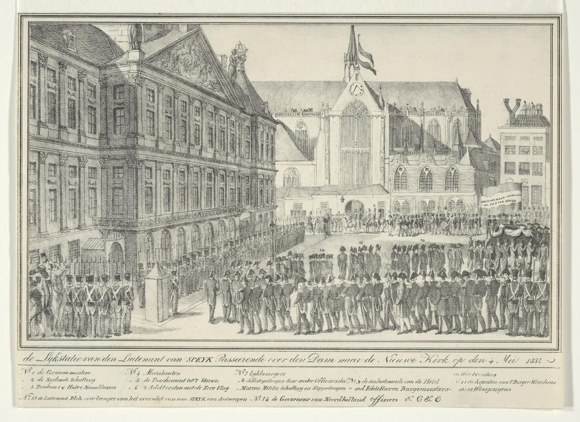 Begrafenisstoet van Van Speyk, op de Dam te Amsterdam, op weg naar de Nieuwe Kerk, 4 mei 1832.