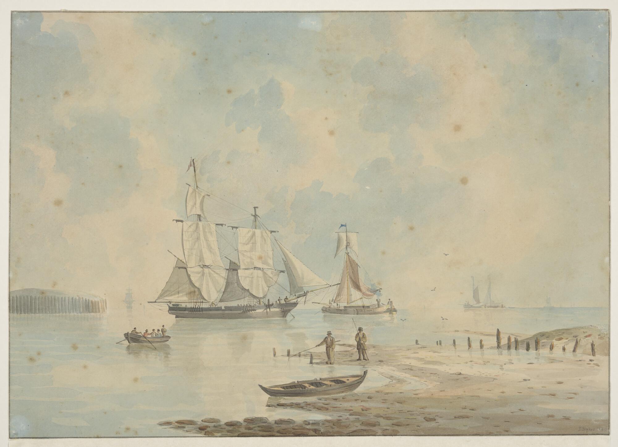 Een kaag en een barkschip op een rede.