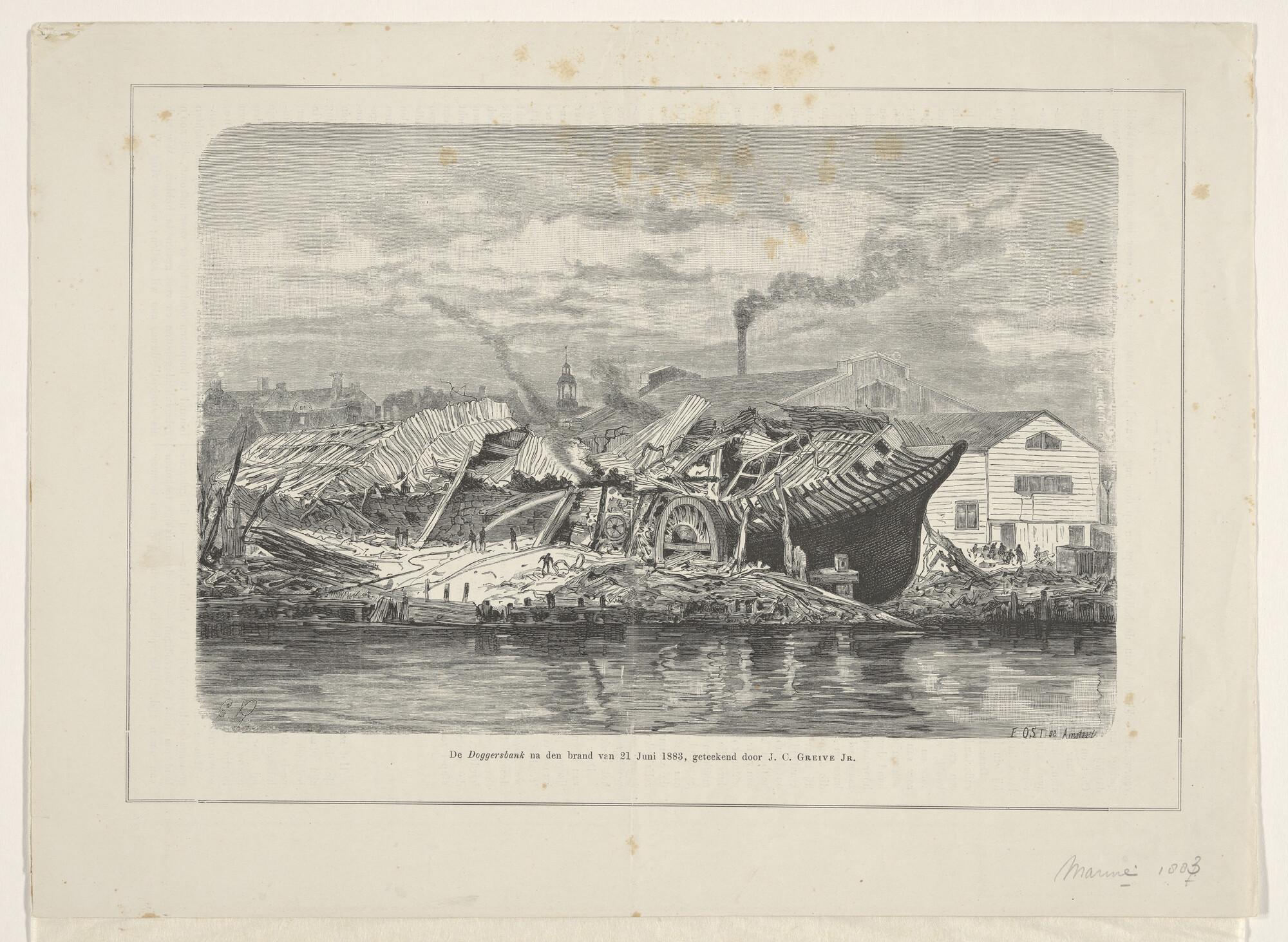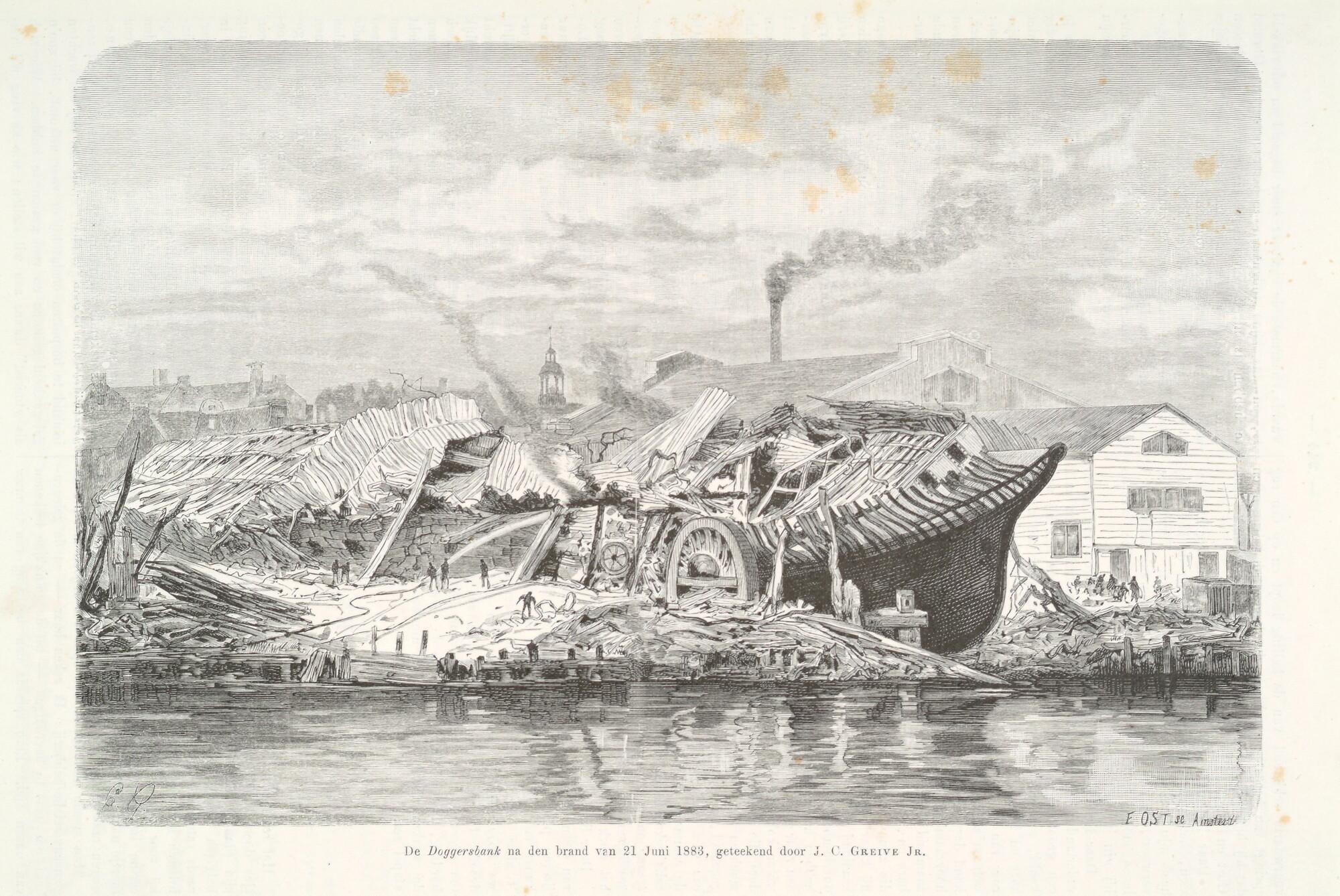 Geïllustreerde pagina afkomstig van het tijdschrift Eigen Haard uit 1883: De Doggersbank na de brand van 21 juni 1883.