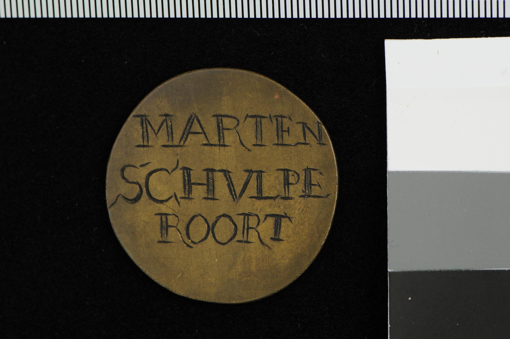 Penning van het Kompas- en Zeilmakersgilde van Amsterdam, gildepenning van Marten Schulperoort (1658-1729).