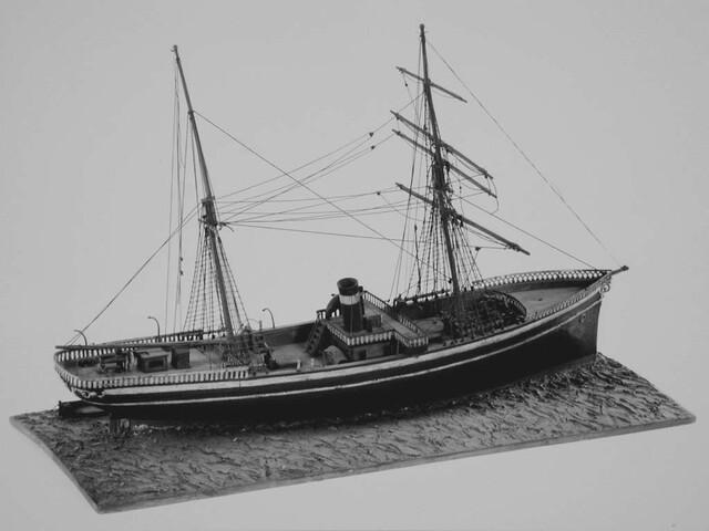 Getuigd model van het zeilstoomschip Willem Drie, geplaatst in een nagebootste zee.