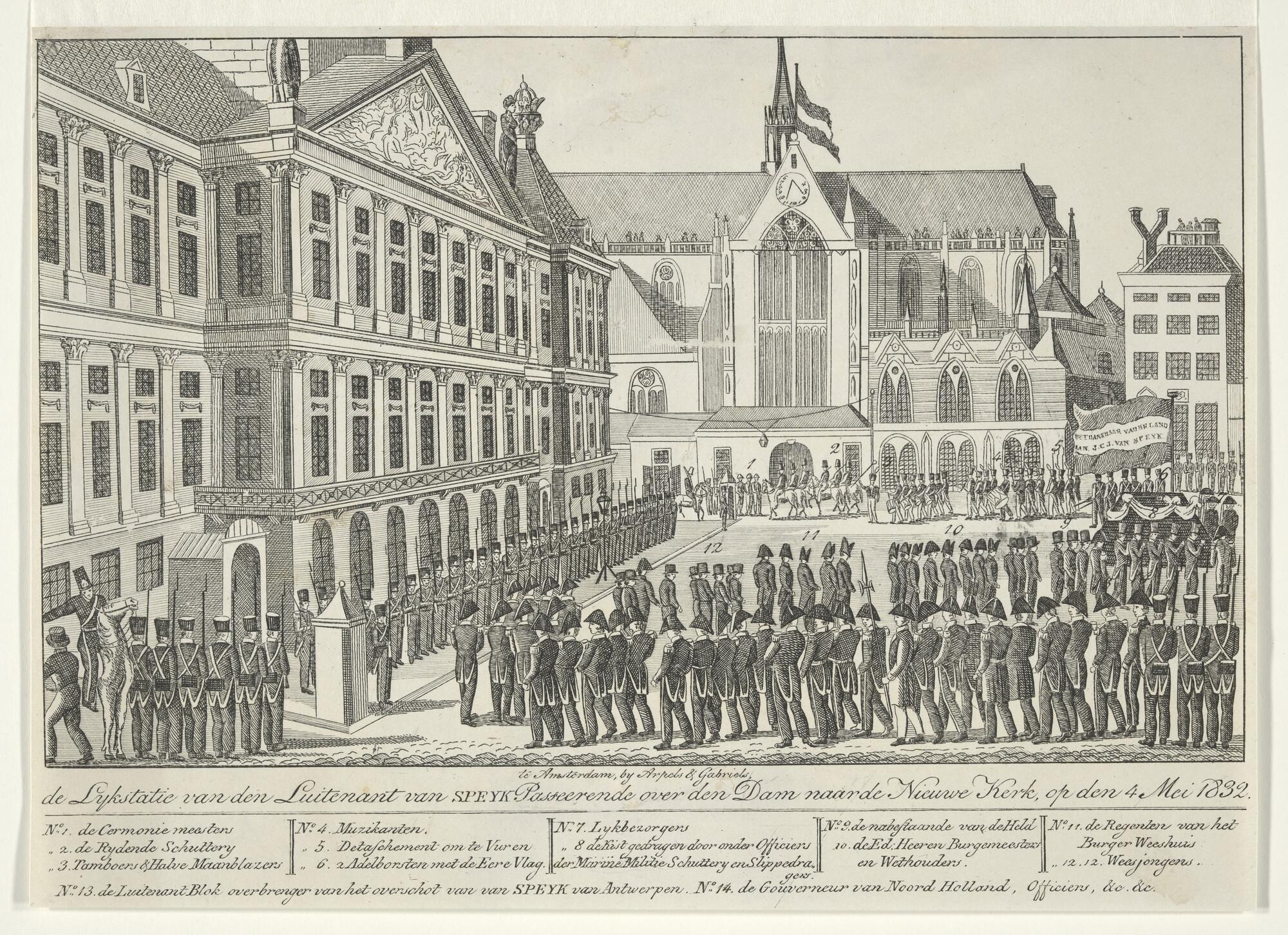 Begrafenisstoet van Van Speyk op de Dam te Amsterdam, op weg naar de Nieuwe Kerk.