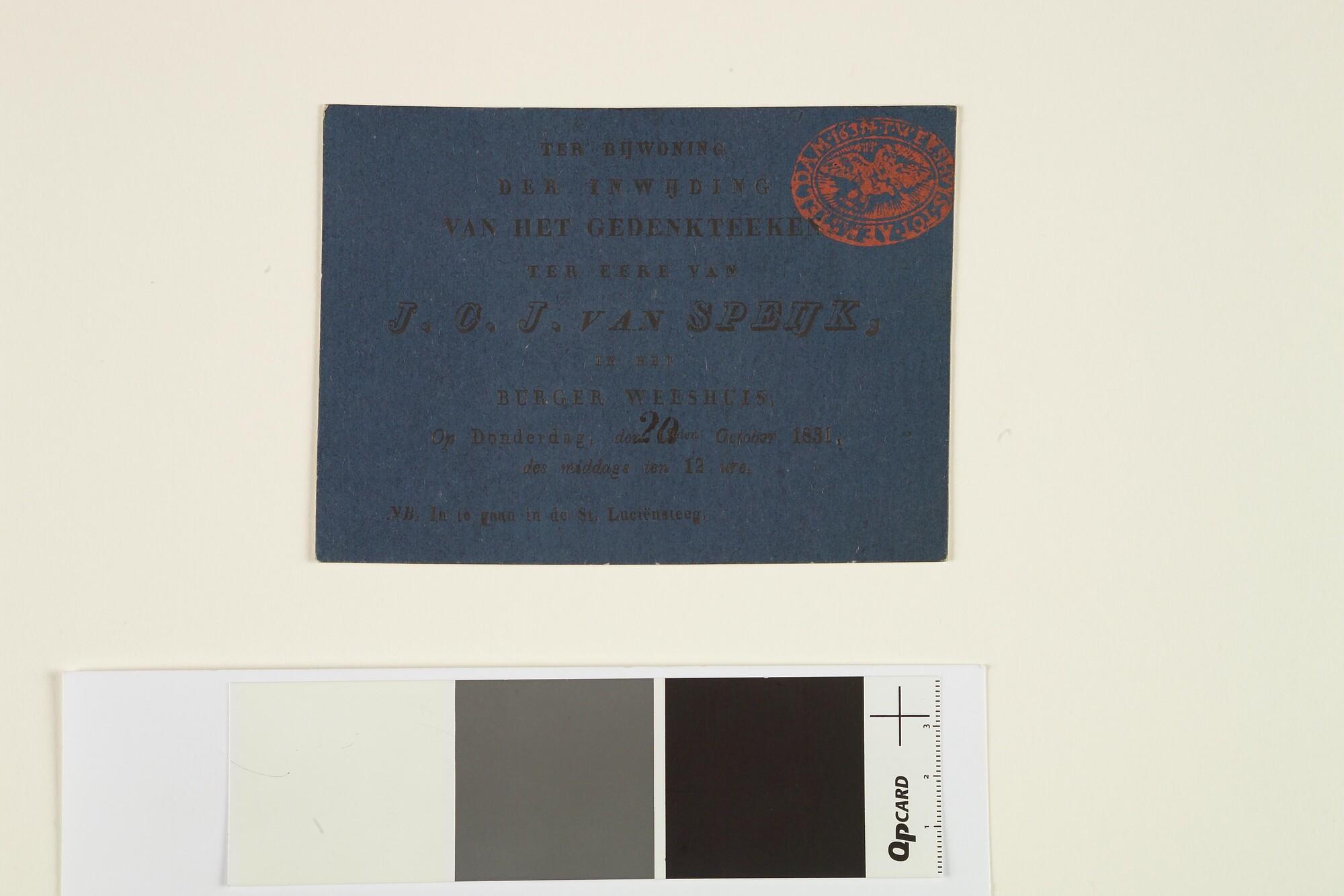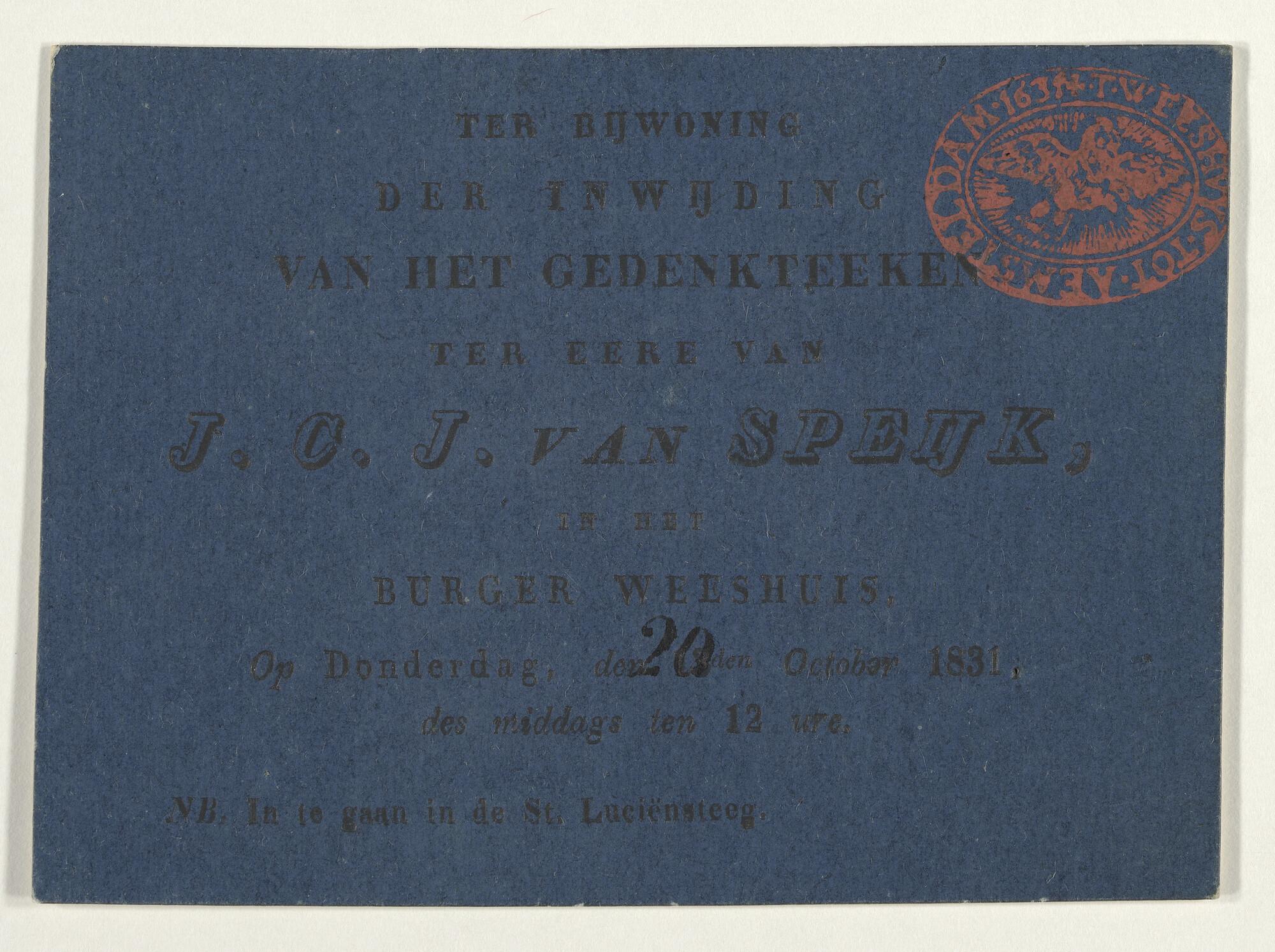 Blauw toegangsbewijs ter bijwoning van de inwijding van het gedenkteken ter ere van Van Speyk in het Burgerweeshuis op 20 oktober 1831