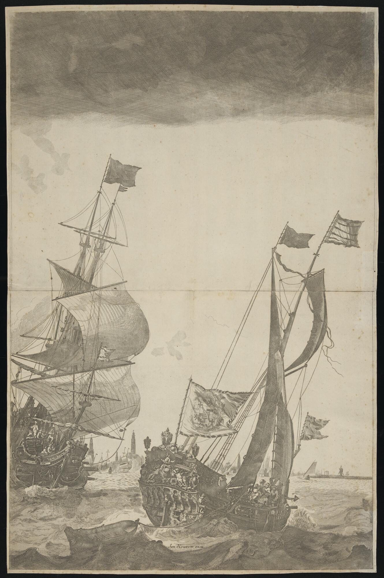Rechterdeel van een grotere gravure, spiegelbeeldige kopie naar een prent die wordt toegeschreven aan Ludolf Backhuysen.