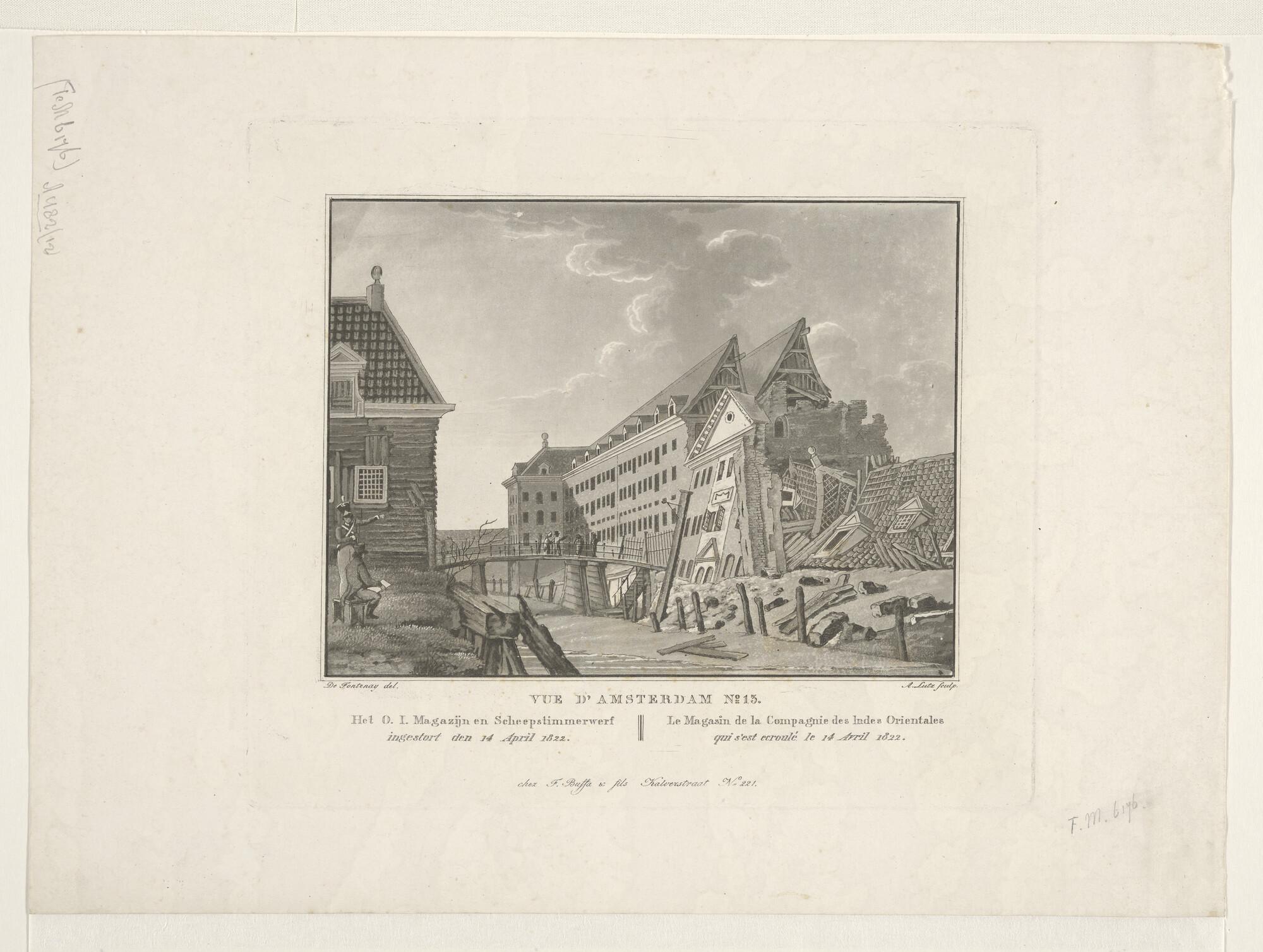 'Vue d'Amsterdam.' Het magazijn van de VOC in Amsterdam, na de instorting op 14 april 1822. Eèn prent uit "Eene verzameling van twaalf afbeeldingen van het instorten van het magazijn der O.I. Compagnie te Amsterdam 1822".