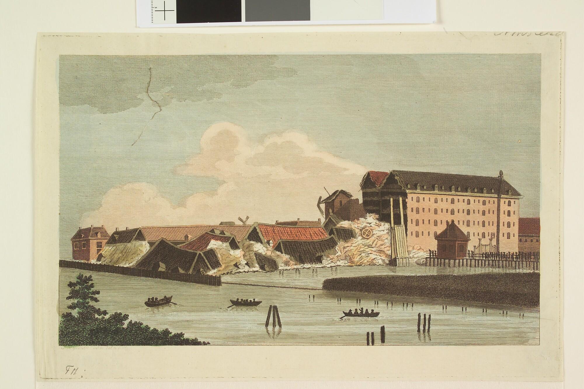 Ruïne van het VOC-magazijn te Amsterdam, na de instorting, 1822. Links de ruïne, rechts een niet ingestort deel van het gebouw, met figuren op de brug. Op de voorgrond drie boten.. Eèn prent uit "Eene verzameling van twaalf afbeeldingen van het instorten van het magazijn der O.I. Compagnie te Amsterdam 1822".