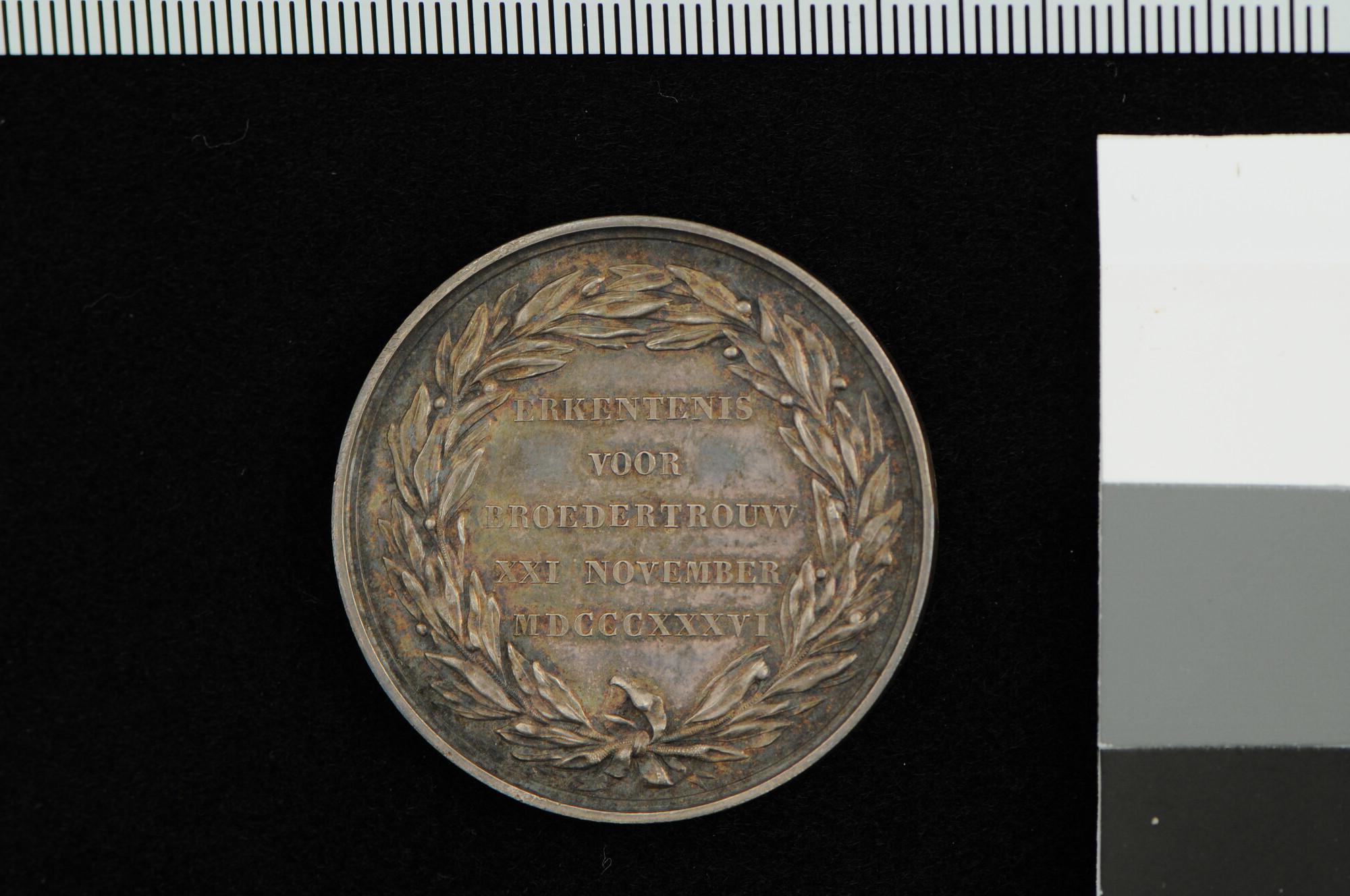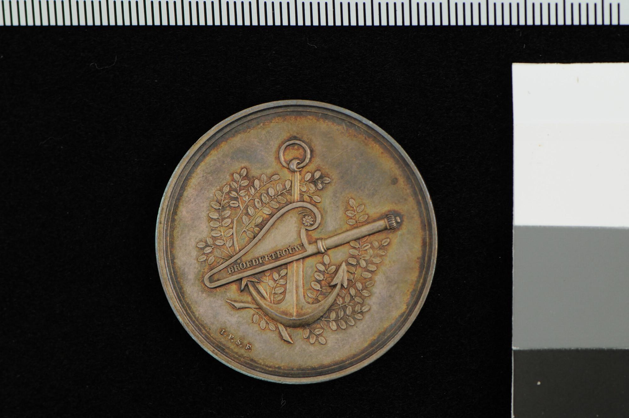 Penning op het van stapel lopen van het schip "Broedertrouw", gebouwd door Johann Schouten, grootmeester van de vrijmetselaarsloge "La Flamboyante" te Dordrecht. Penning aan de aanwezigen uitgereikt, 1836.