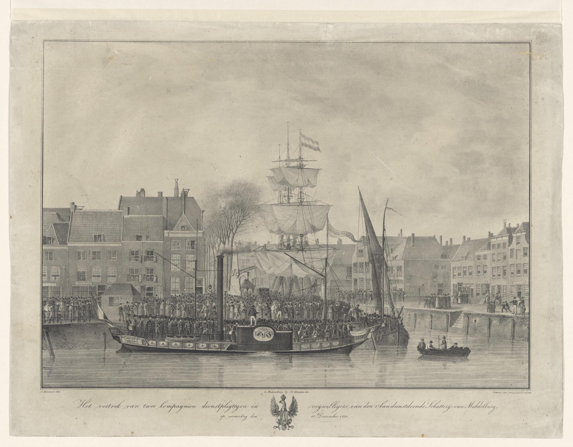Het vertrek van twee compagnieën dientsplichtigen en vrijwilligers van de schutterij van Middelburg naar Brabant, 1 december 1830; in het midden het raderstoomschip "Prinses Marianne"