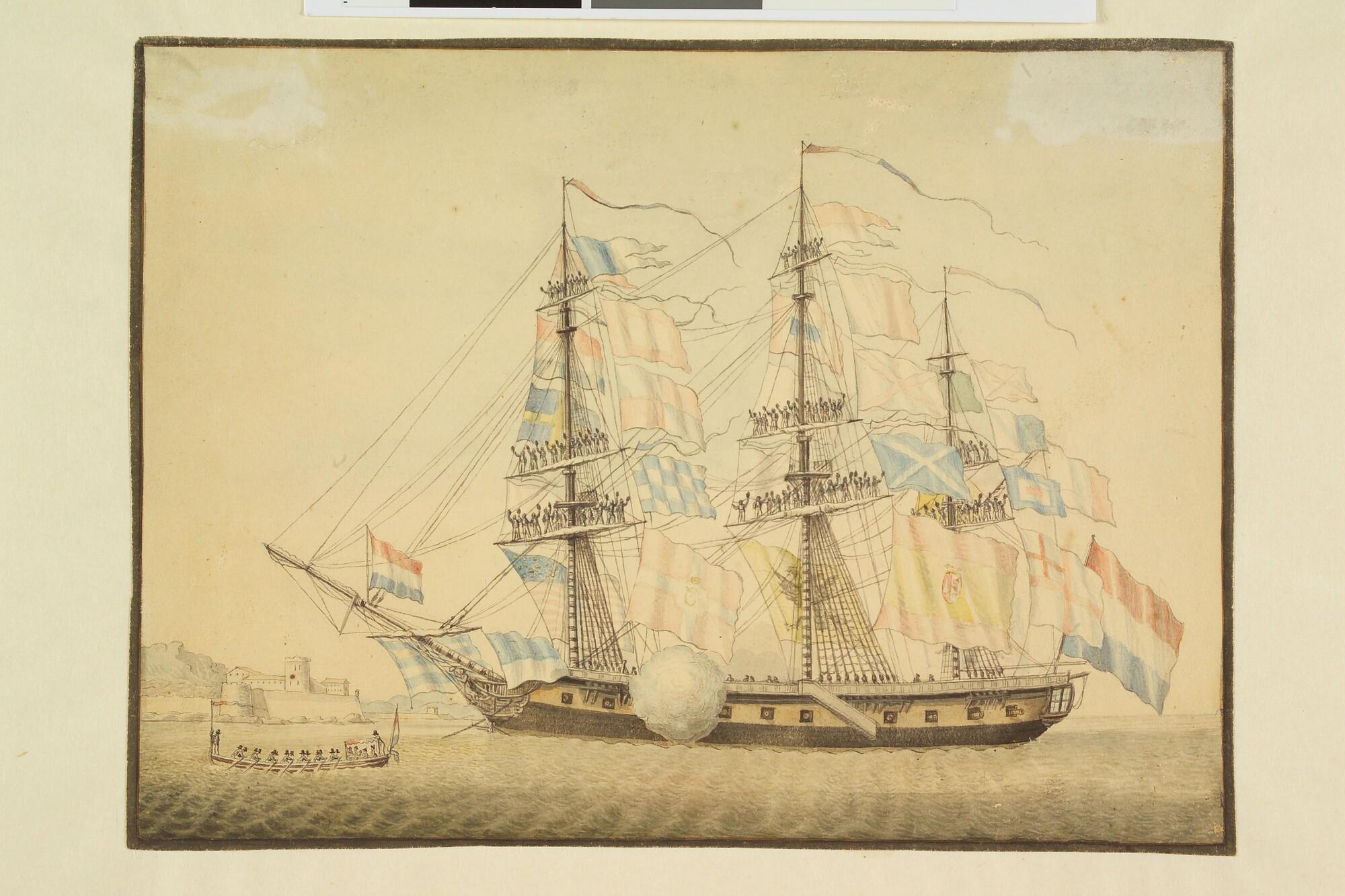 Paraderen aan boord van een pavoiserend oorlogsschip. Links een 14-riemssloep. (Vermoedelijk het bezoek van Koningin Anna Paulowna aan het eskader van Prins Hendrik in Genua, 28 september 1846).