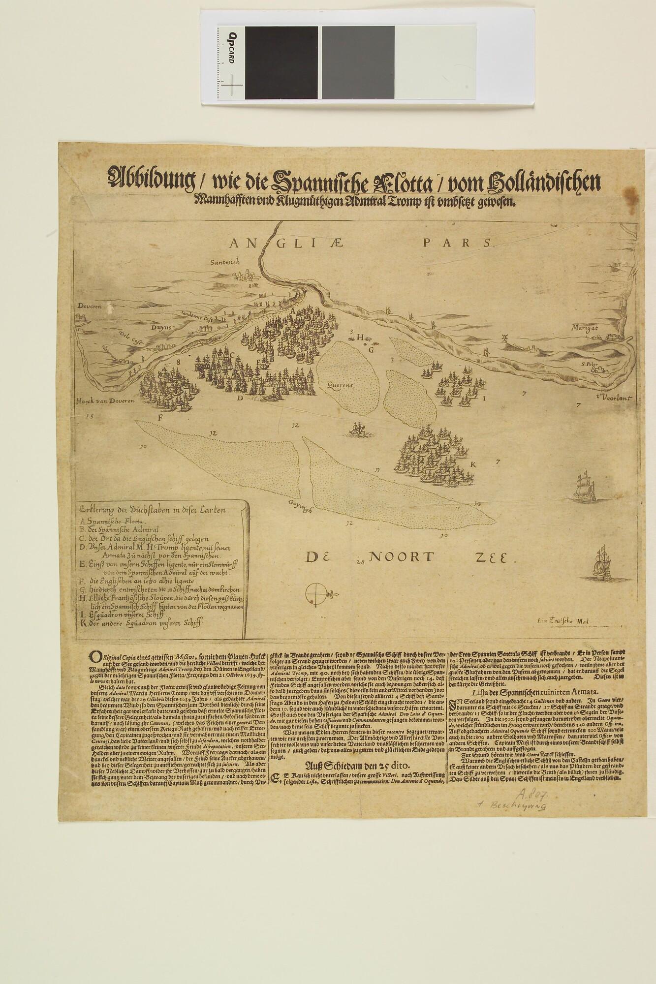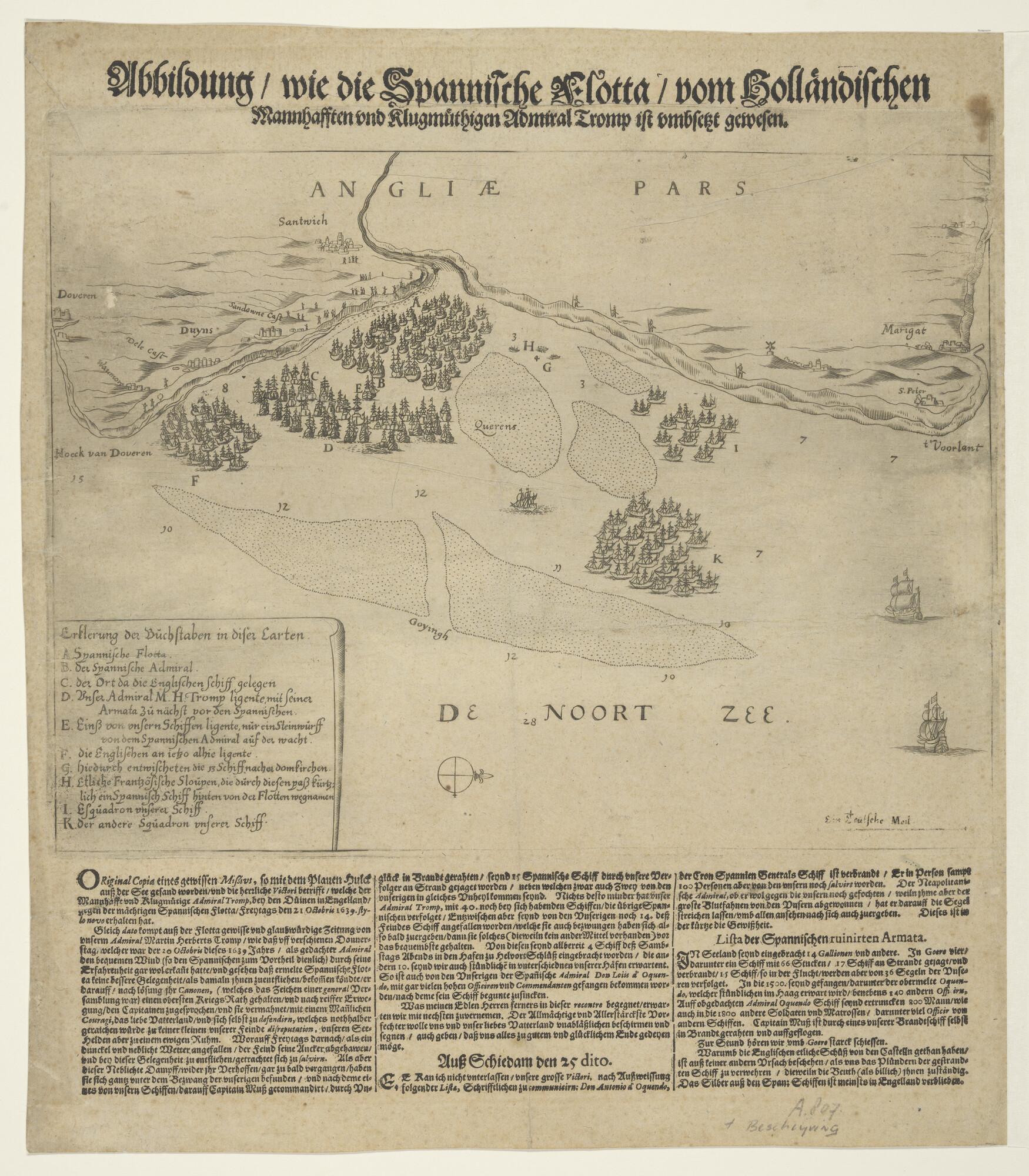 Duitse prent over de omsingeling van de Spaanse vloot door Admiraal Tromp tijdens de Slag bij Duins, 1639.