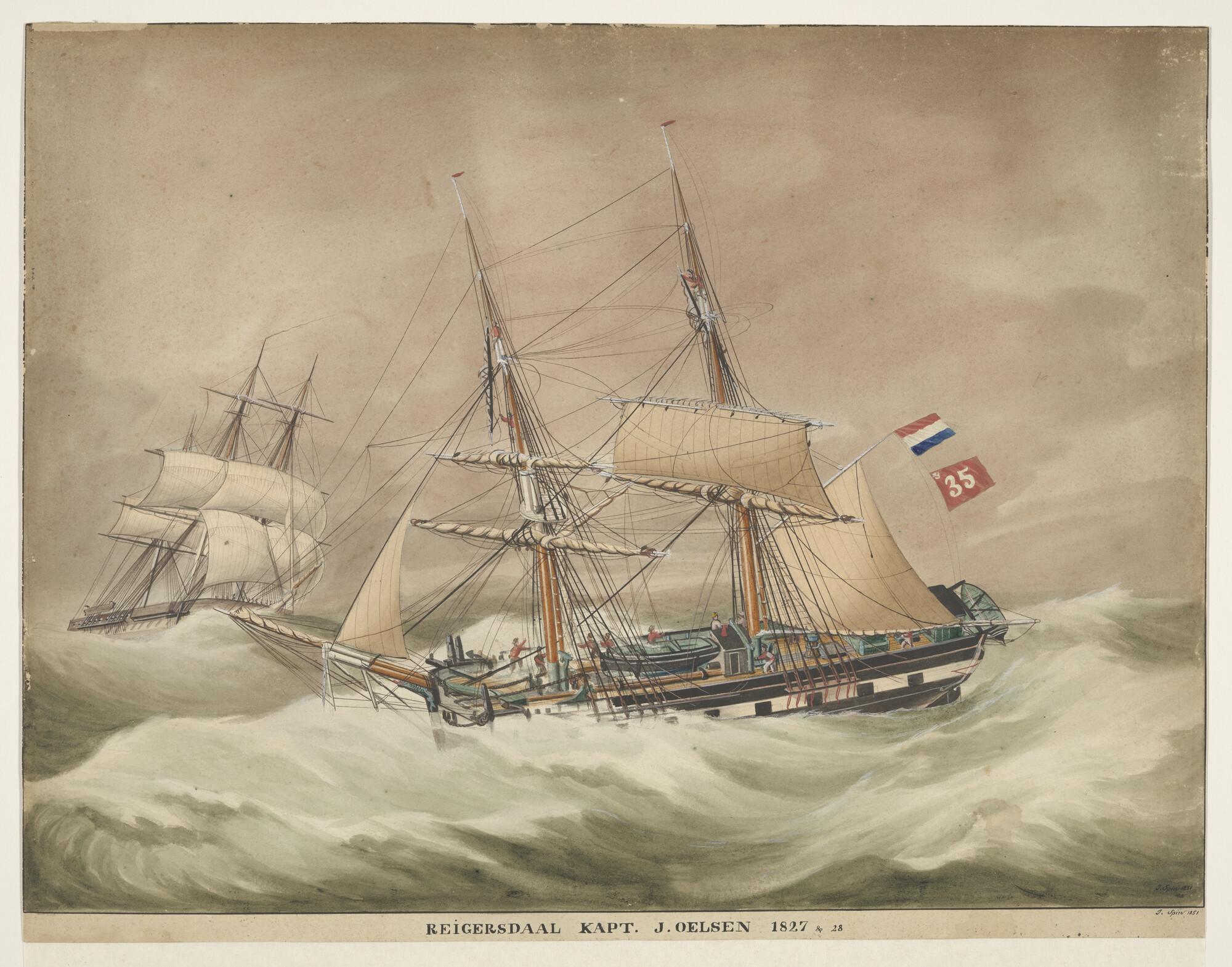 Het brikschip Reigersdaal bijliggend in een storm.