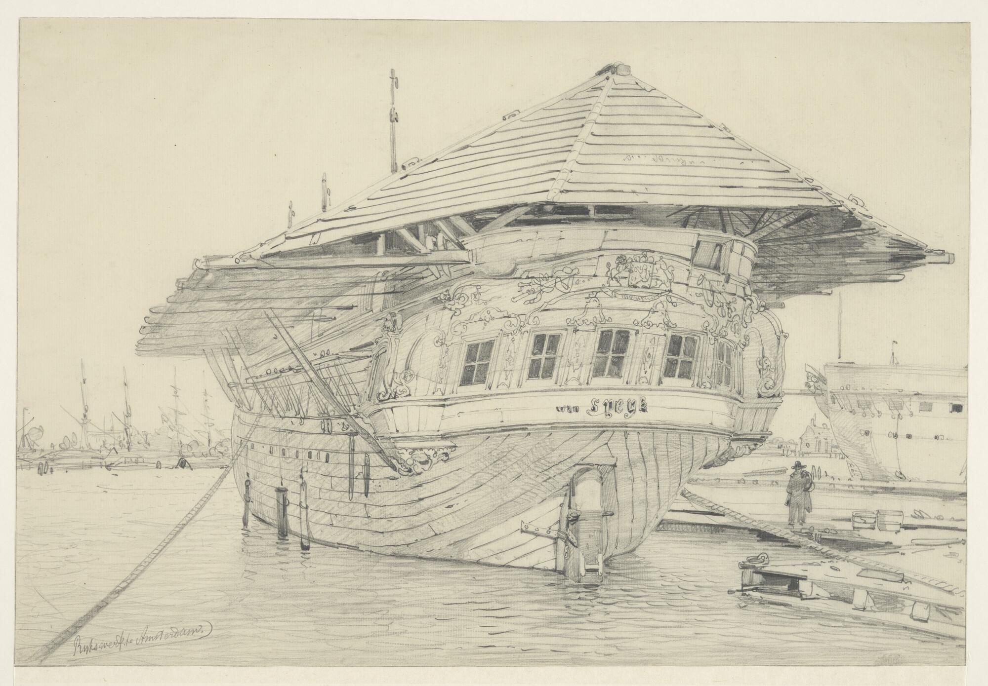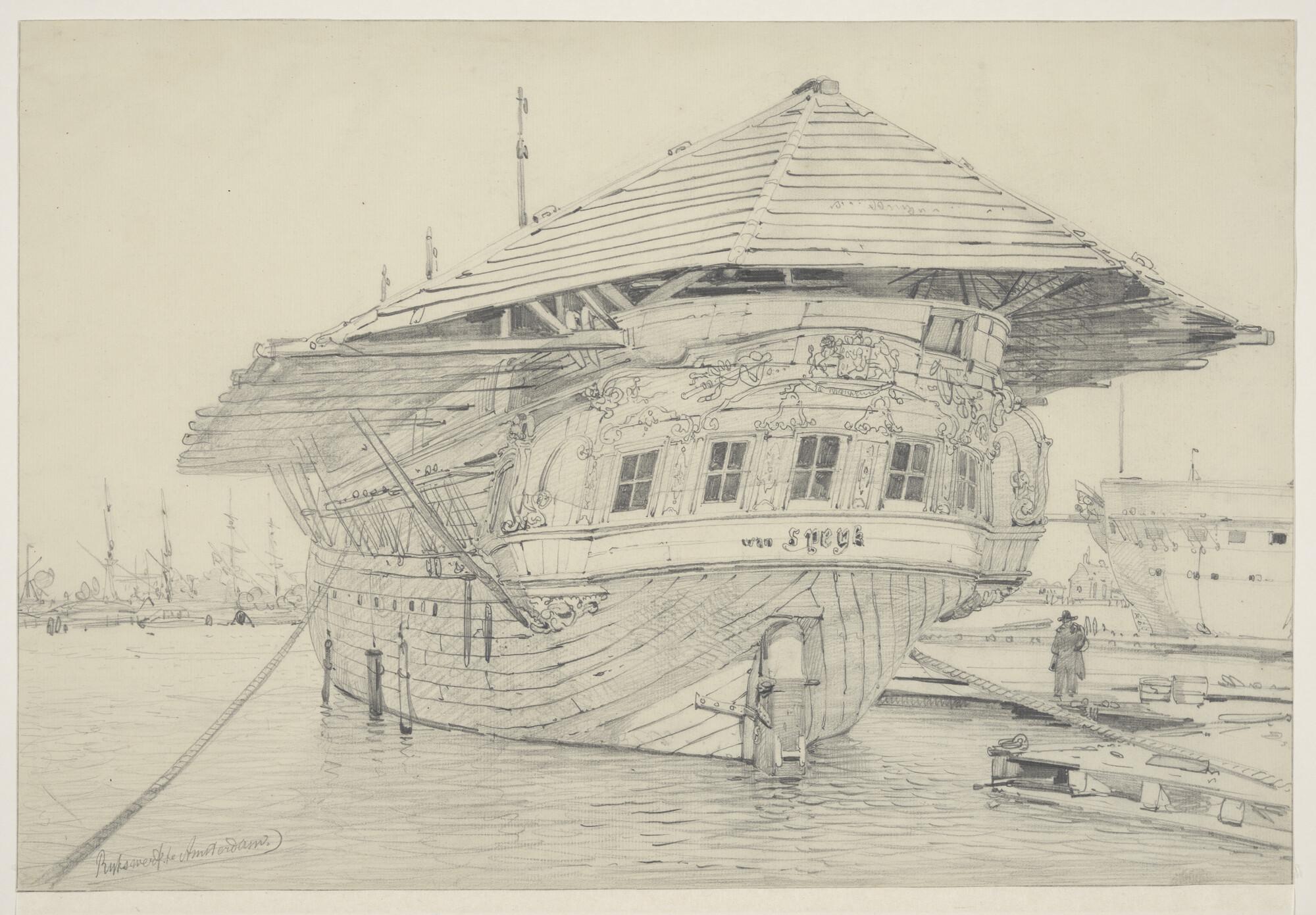 Het logementsschip 'Van Speyk' afgemeerd aan de Rijkswerf te Amsterdam