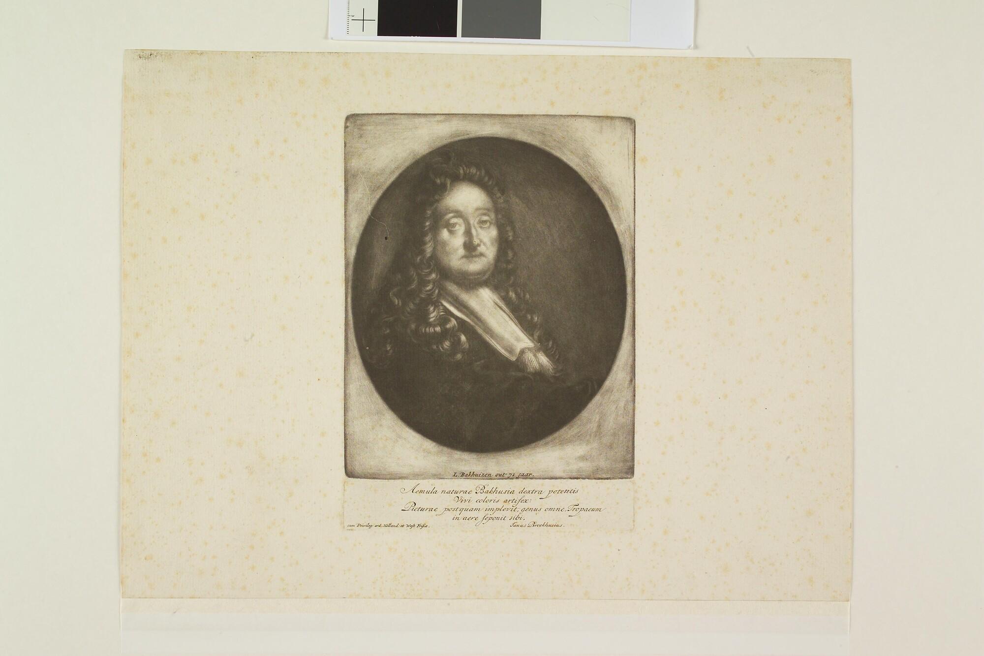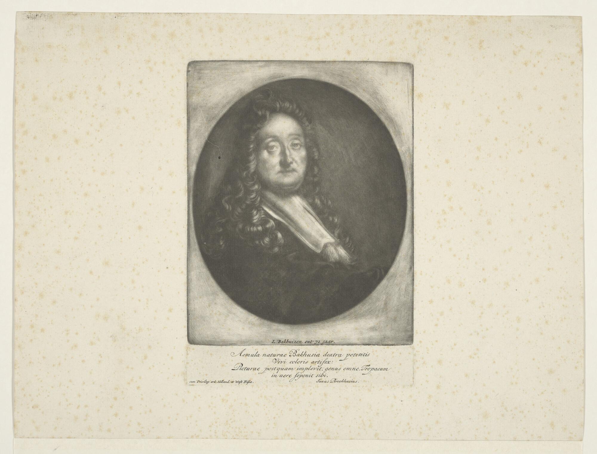 Portret van Ludolf Backhuysen, met daaronder een vierregelig gedicht in het Latijn door Janus Broekhusius (Broekhuizen).