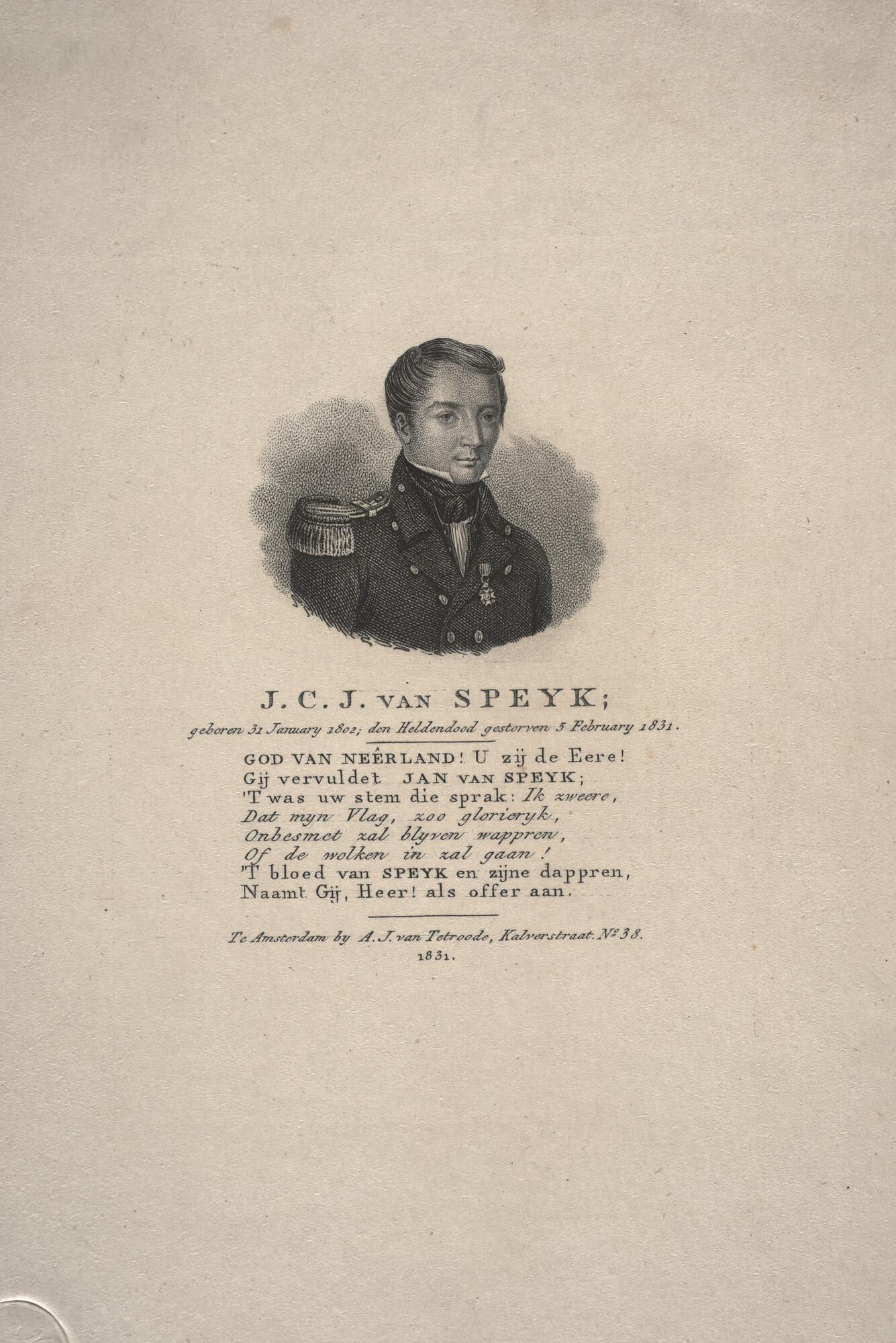 Portret van J.C.J. van Speyk, met daaronder een lofdicht van 8 regels.