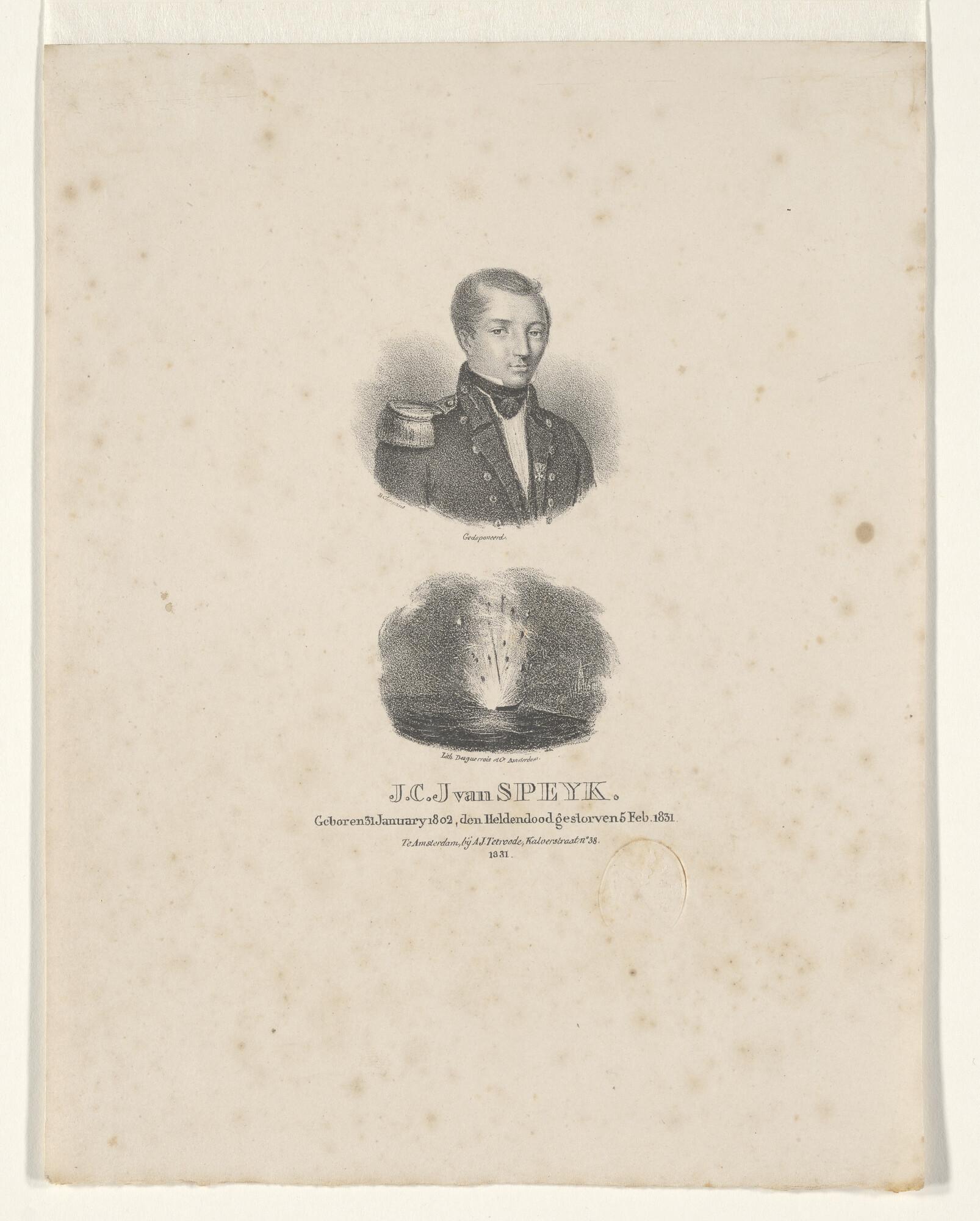 Portret van Van Speyk en de ontploffing van zijn schip.