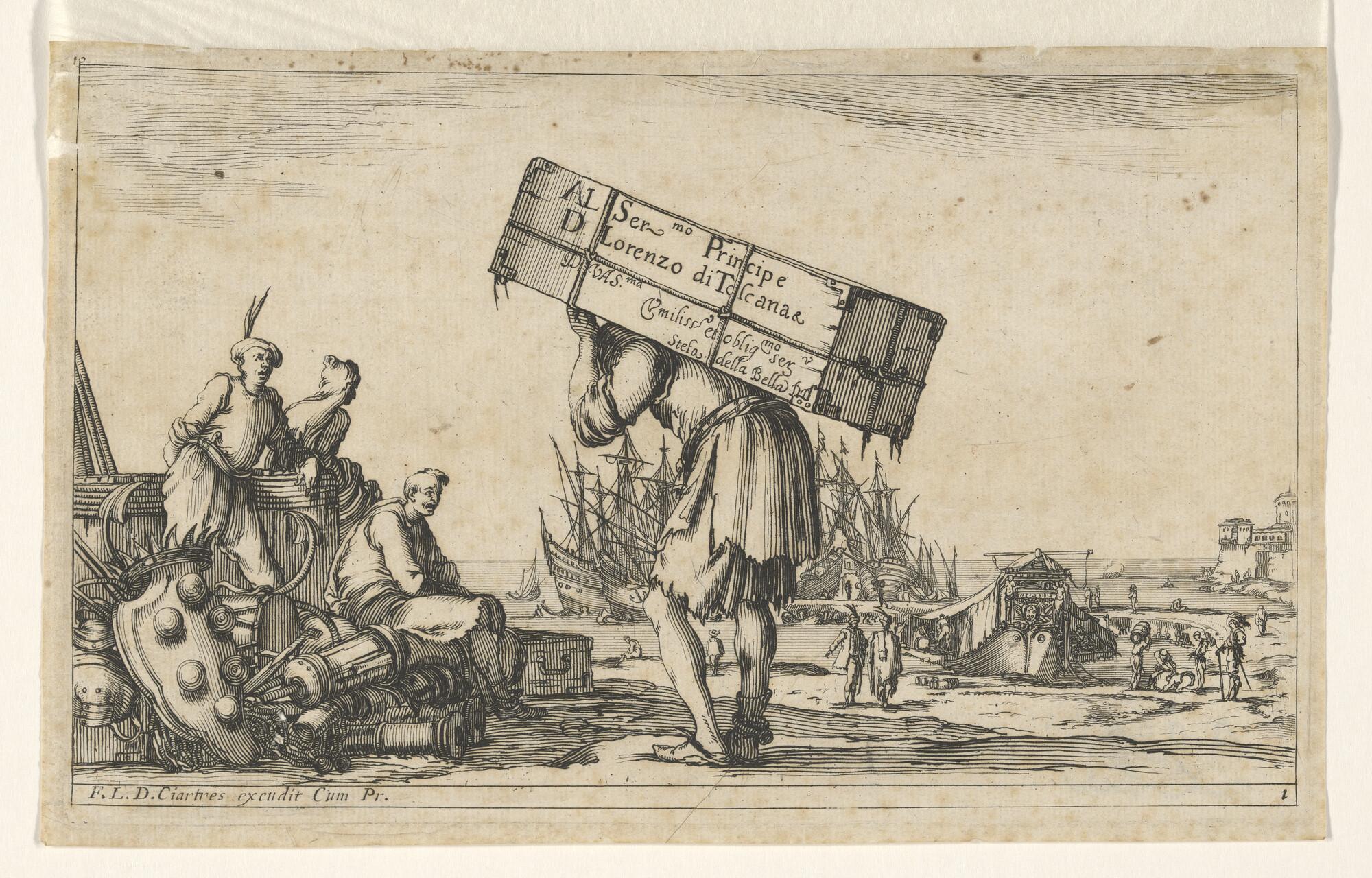 Titelblad van Franse serie van acht gravures met voornamelijk galeien.