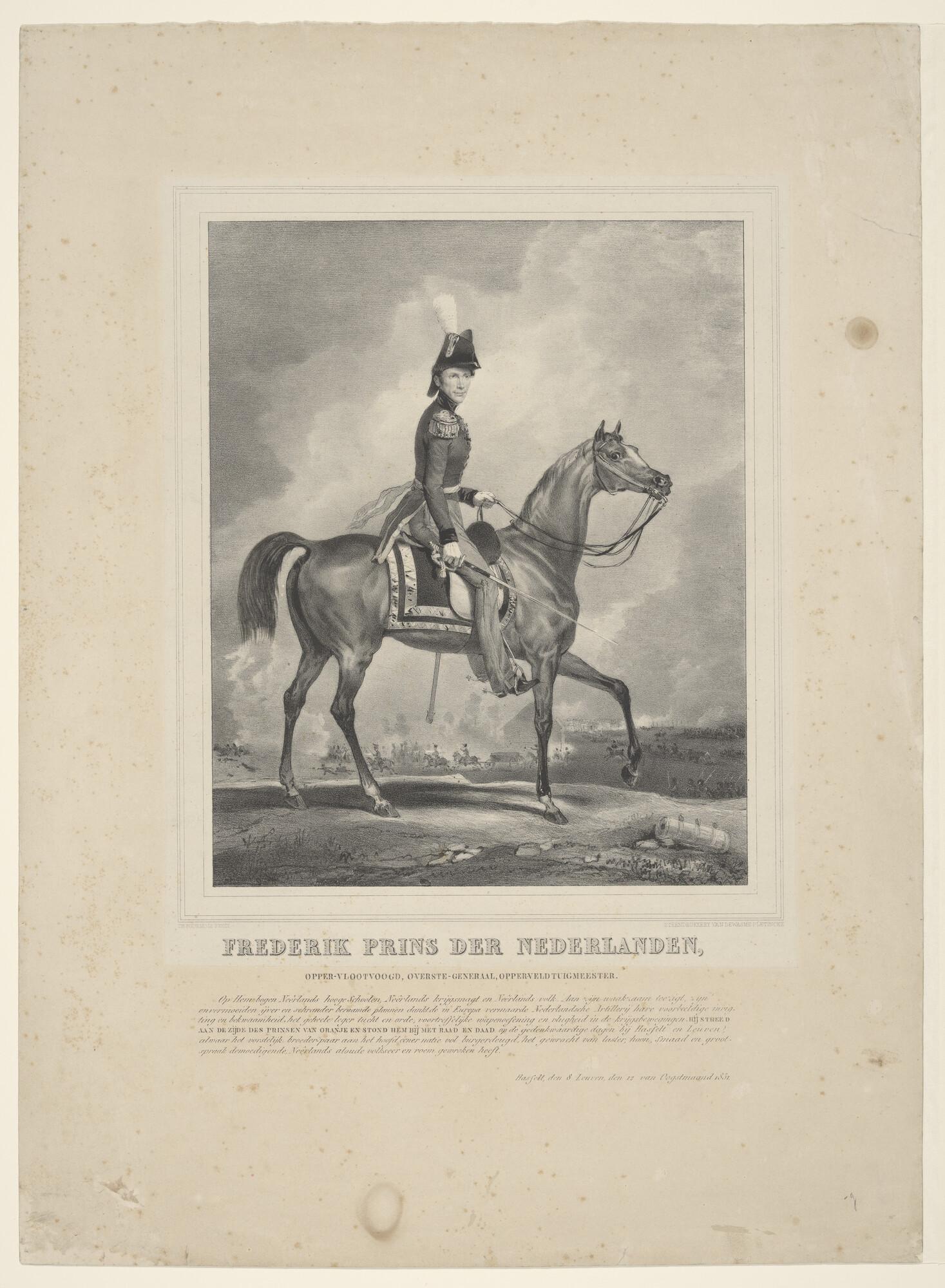 Frederik Prins der Nederlanden. Portret te paard van Frederik Prins der Nederlanden, rechts het slagveld.