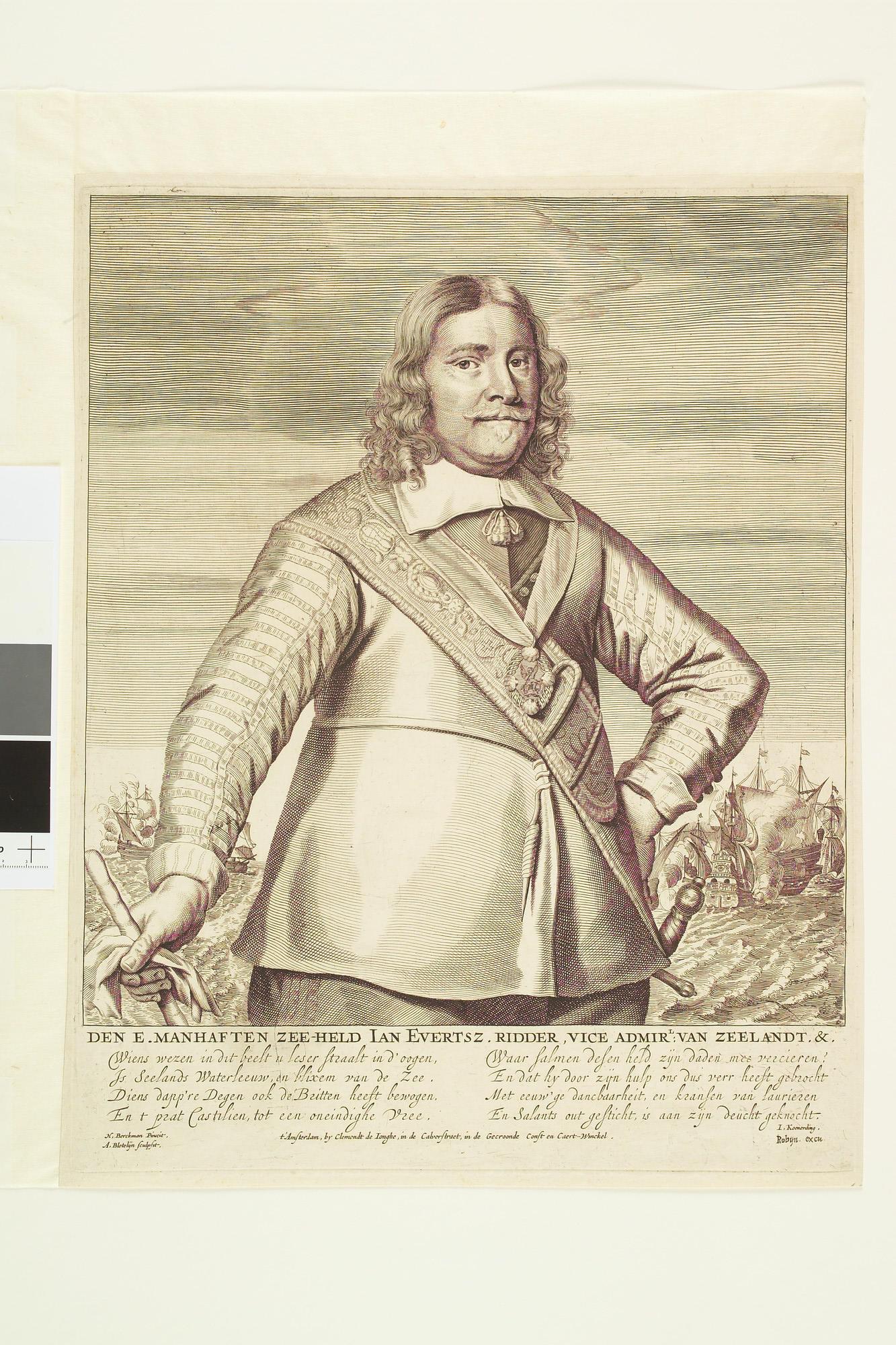 Portret van Jan Evertsen de Oude, luitenant-admiraal van Zeeland; onder porret een en 8-regelig vers in 2 kolommen door J. Koenerding.