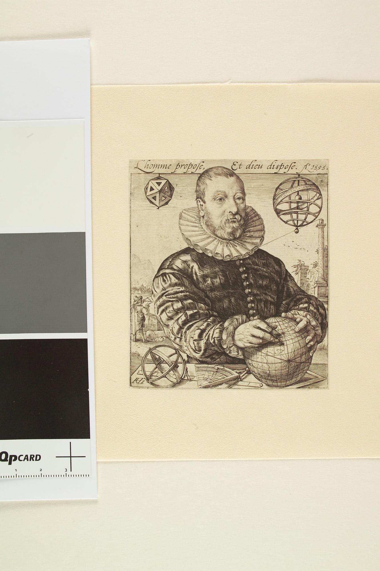Portret van de wiskundige en astronoom Nicolaas Petri van Deventer, met in zijn handen een aardglobe en om zich heen astronomische instrumenten.