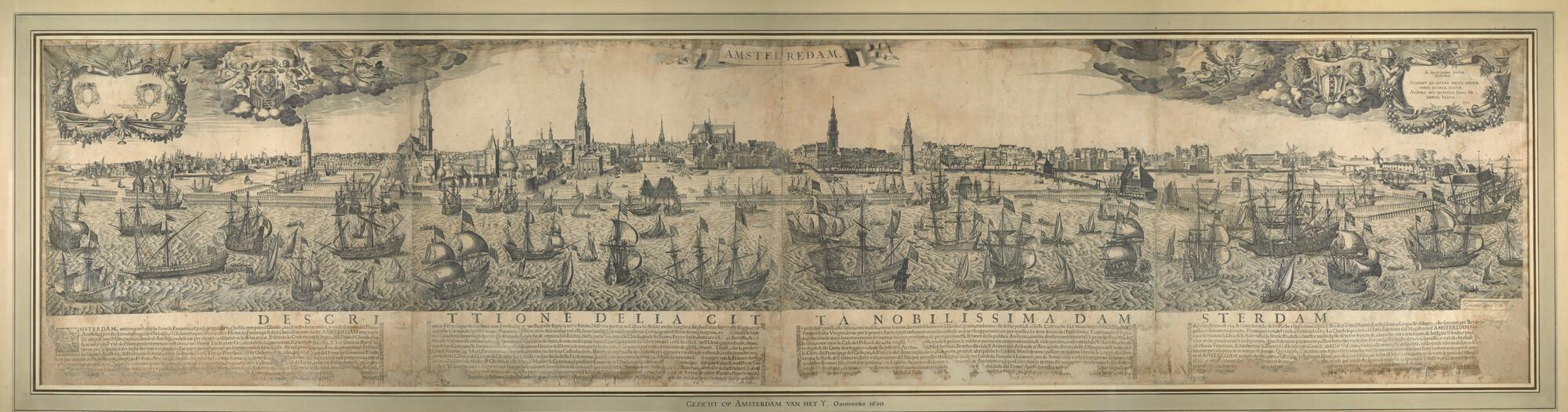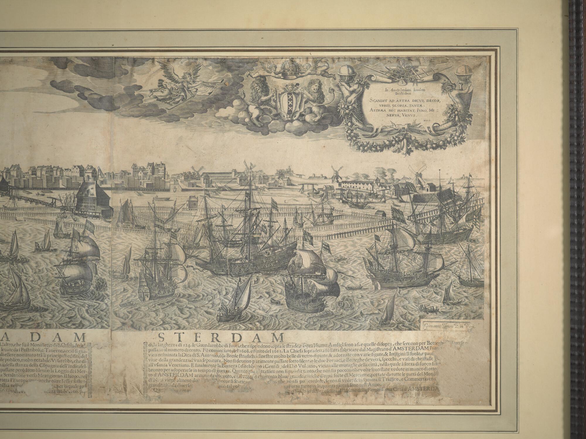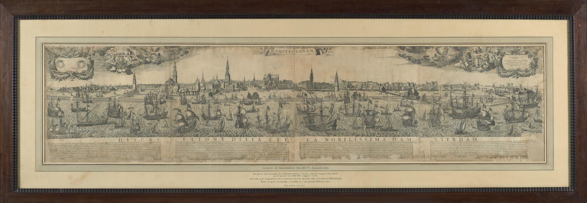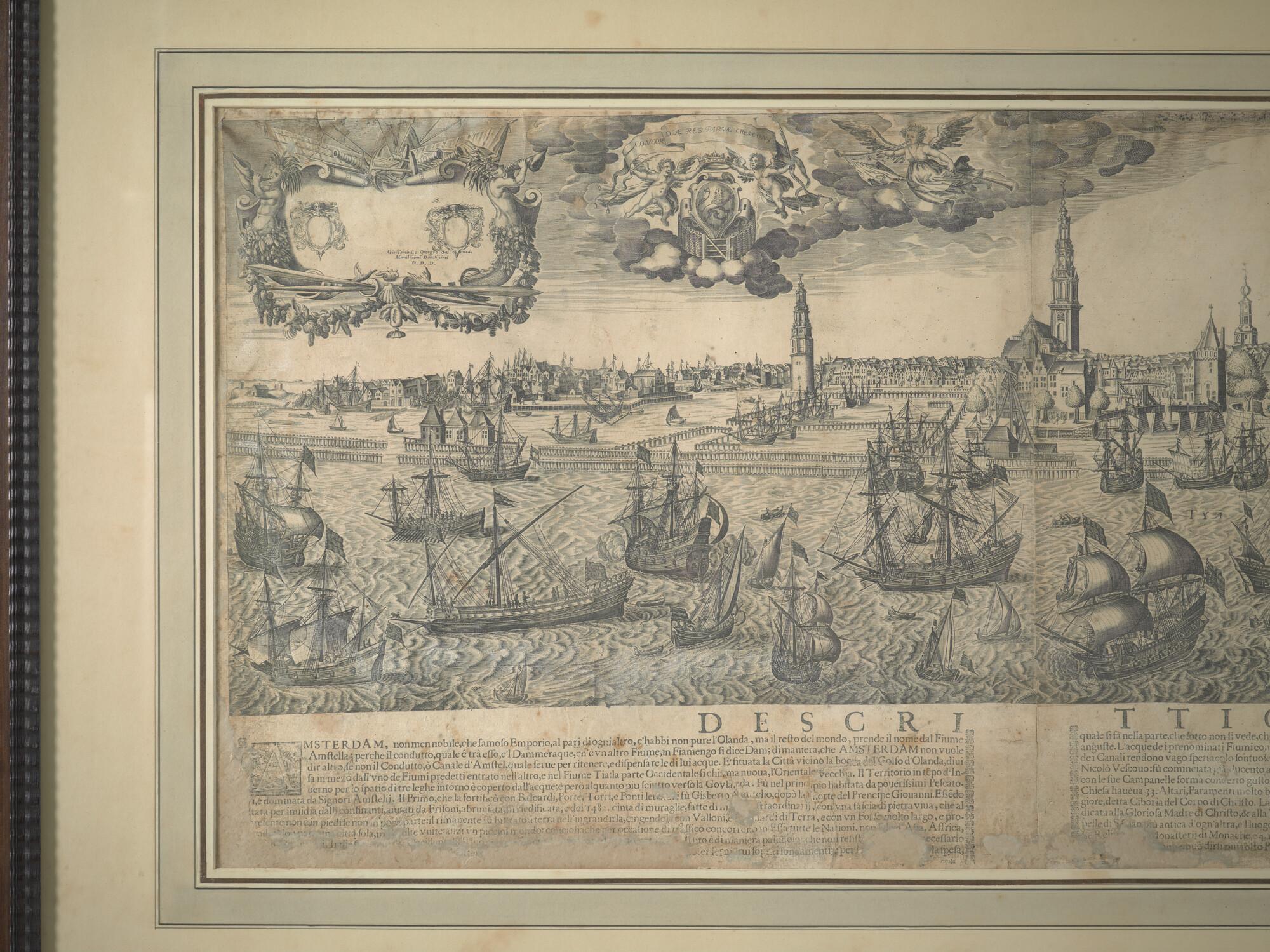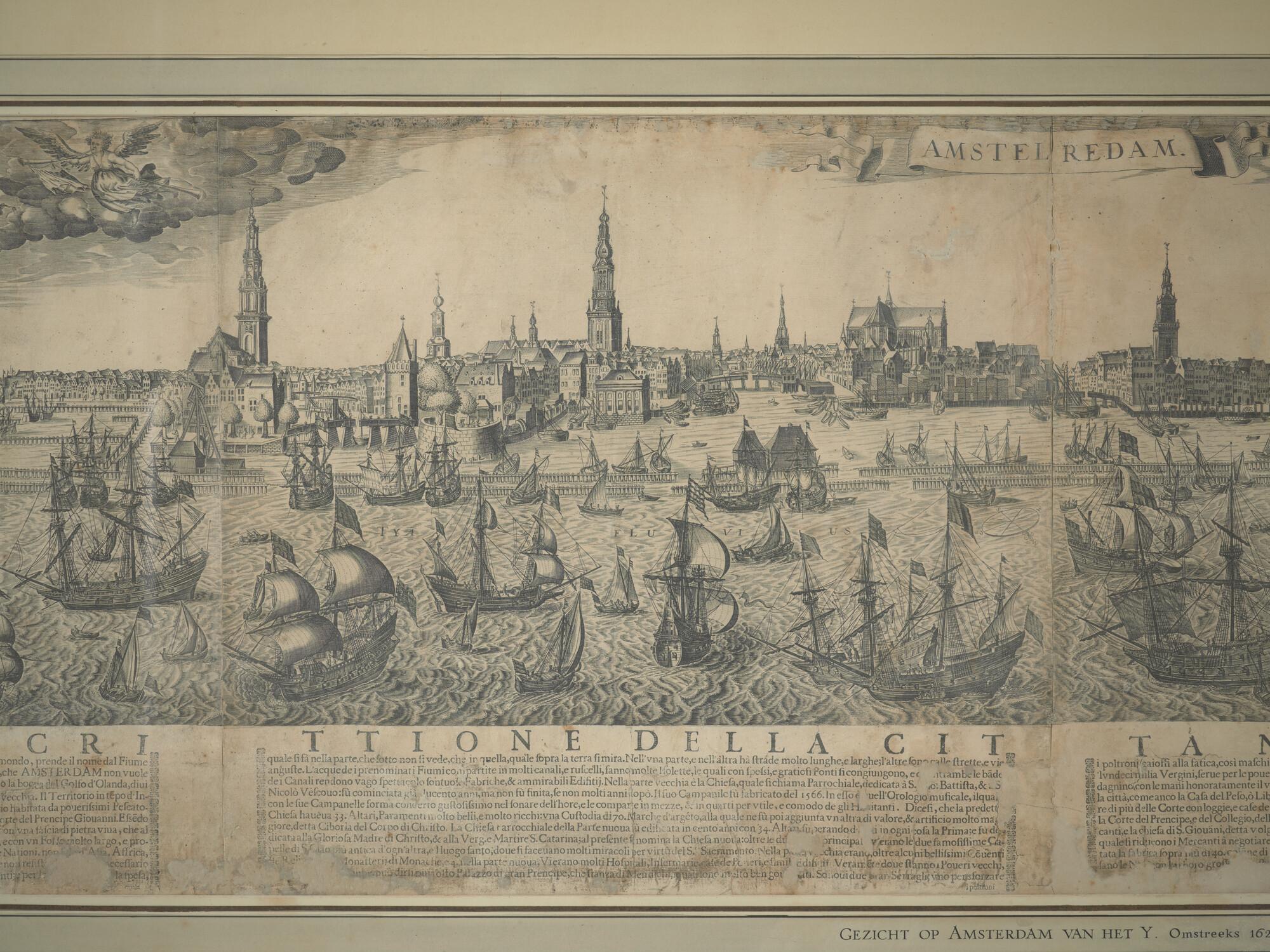 Gezicht op Amsterdam van het IJ, stadsprofiel. Onder de gravure een beschrijving van de stad in het Italiaans, gedrukt in 4 kolommen.