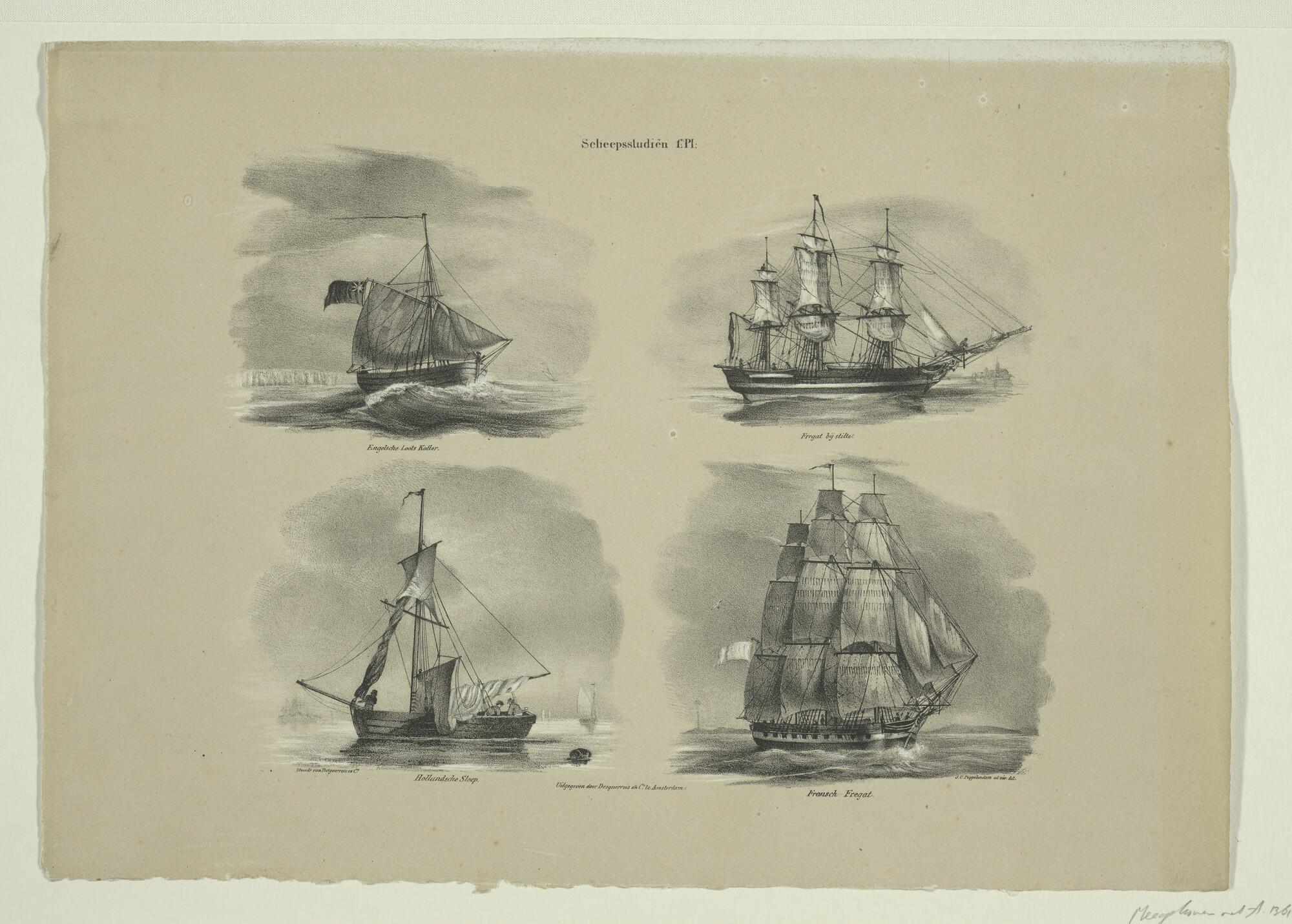 Een Engelse loodskotter, een fregat, een Hollands sloepschip en een Frans fregatschip.