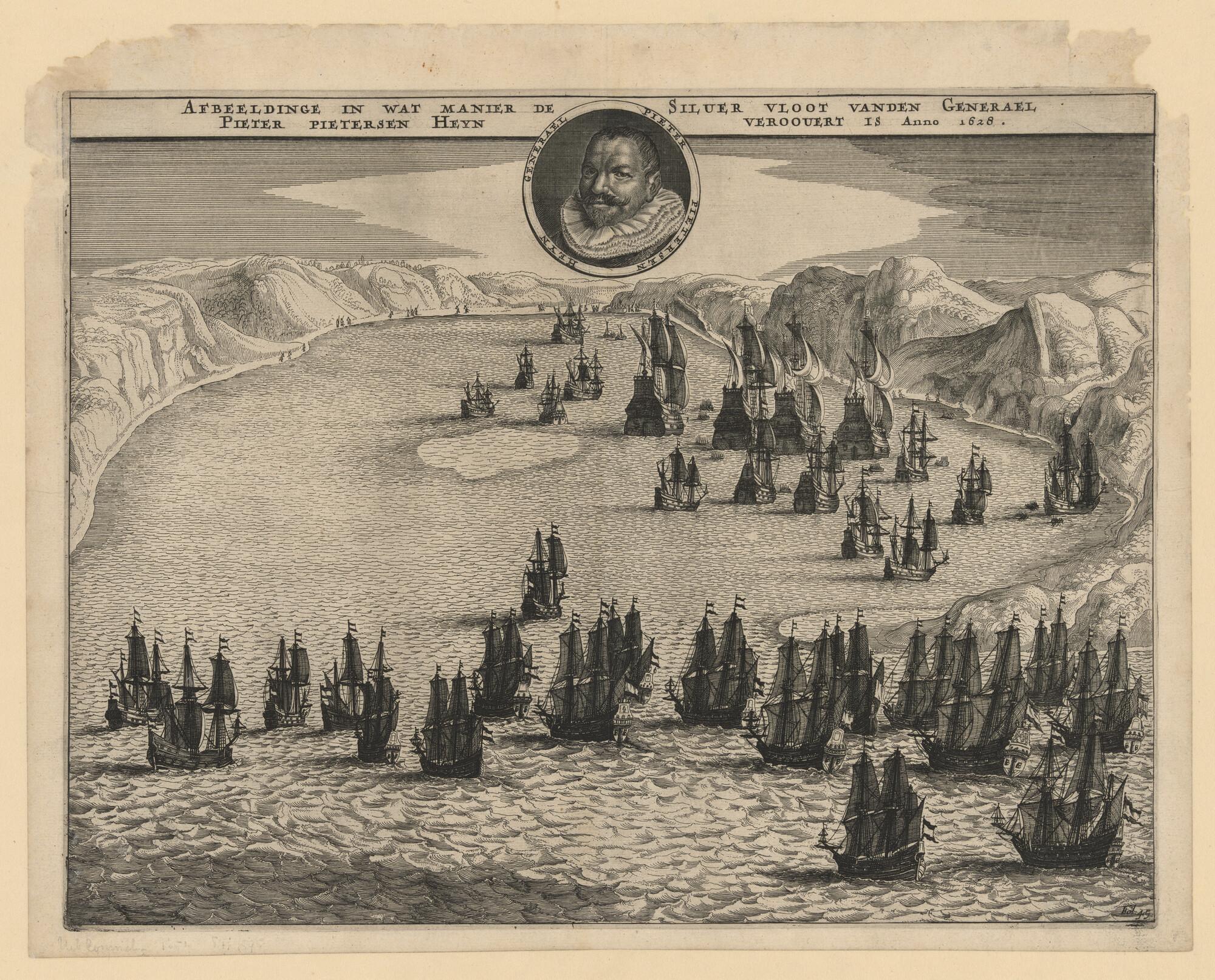 De verovering van de zilvervloot in de Baai van Matanca of Matanza, 1628. Illustratie uit I. Commelin, Frederick Hendrick van Nassau, 1651.