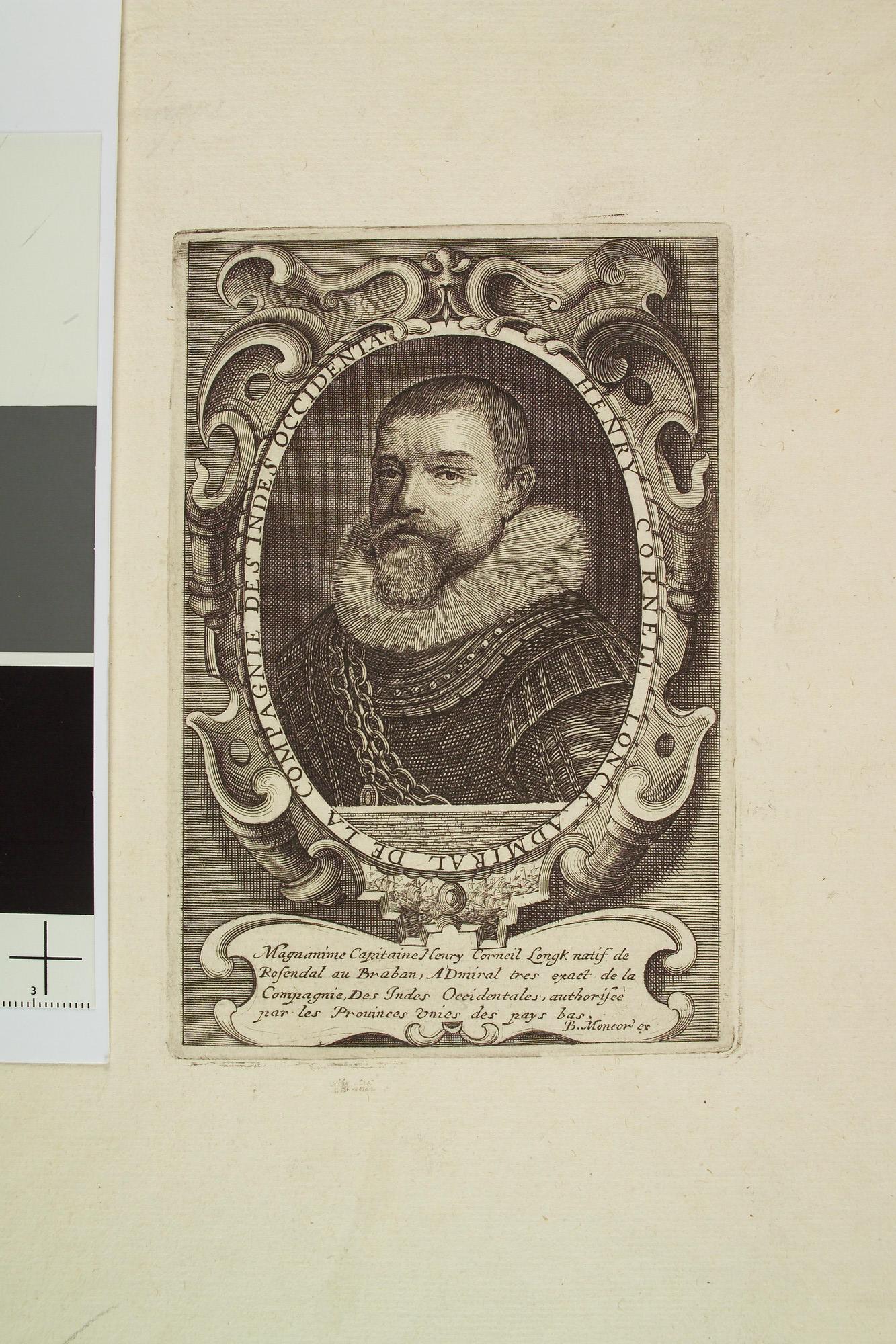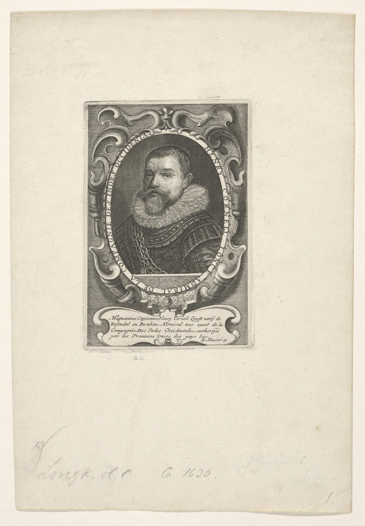 Portret van Hendrick C. Lonck (1568 - 1638), borstbeeld naar links in ovalen cartouche, met randschrift en vierregelig onderschrift.
