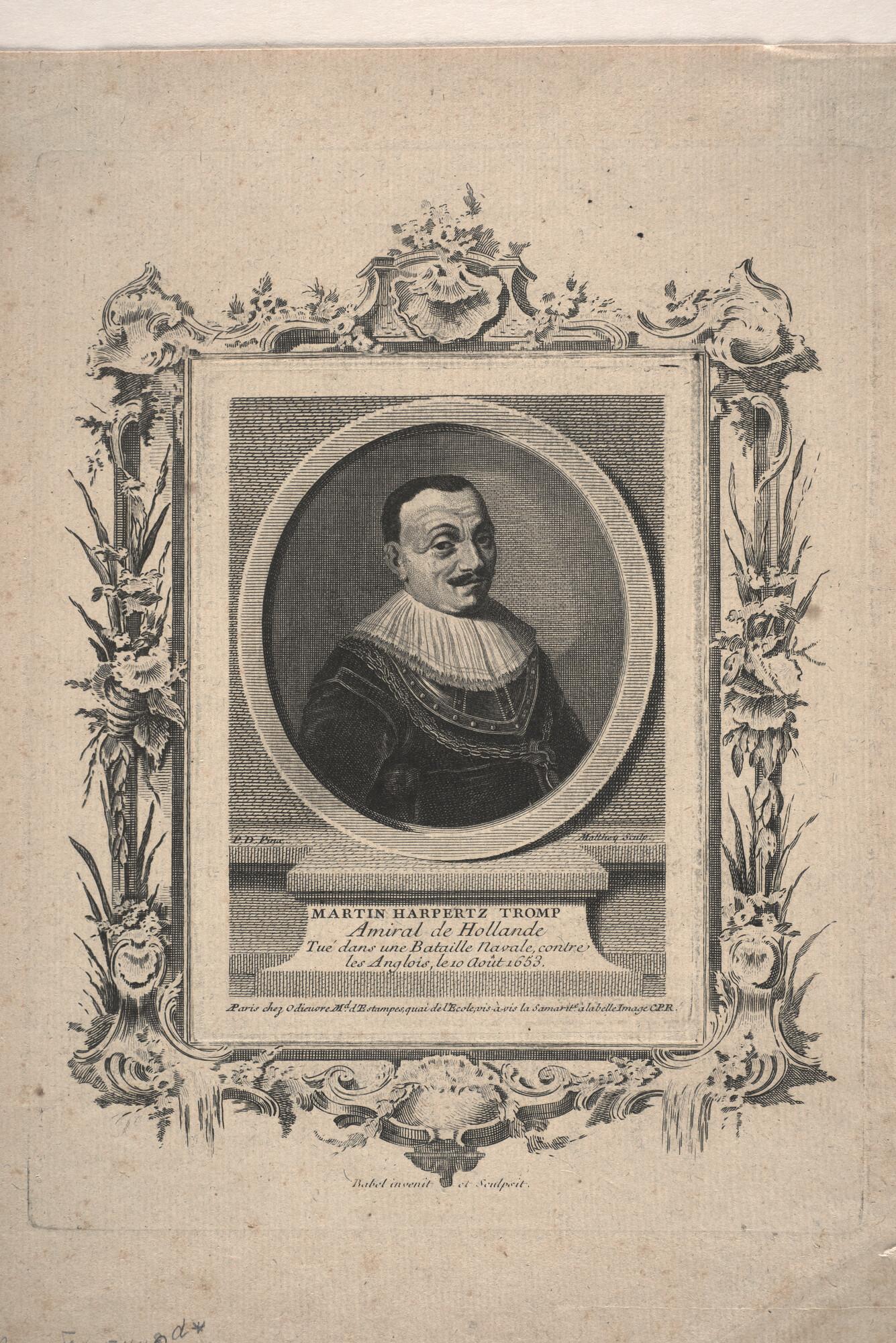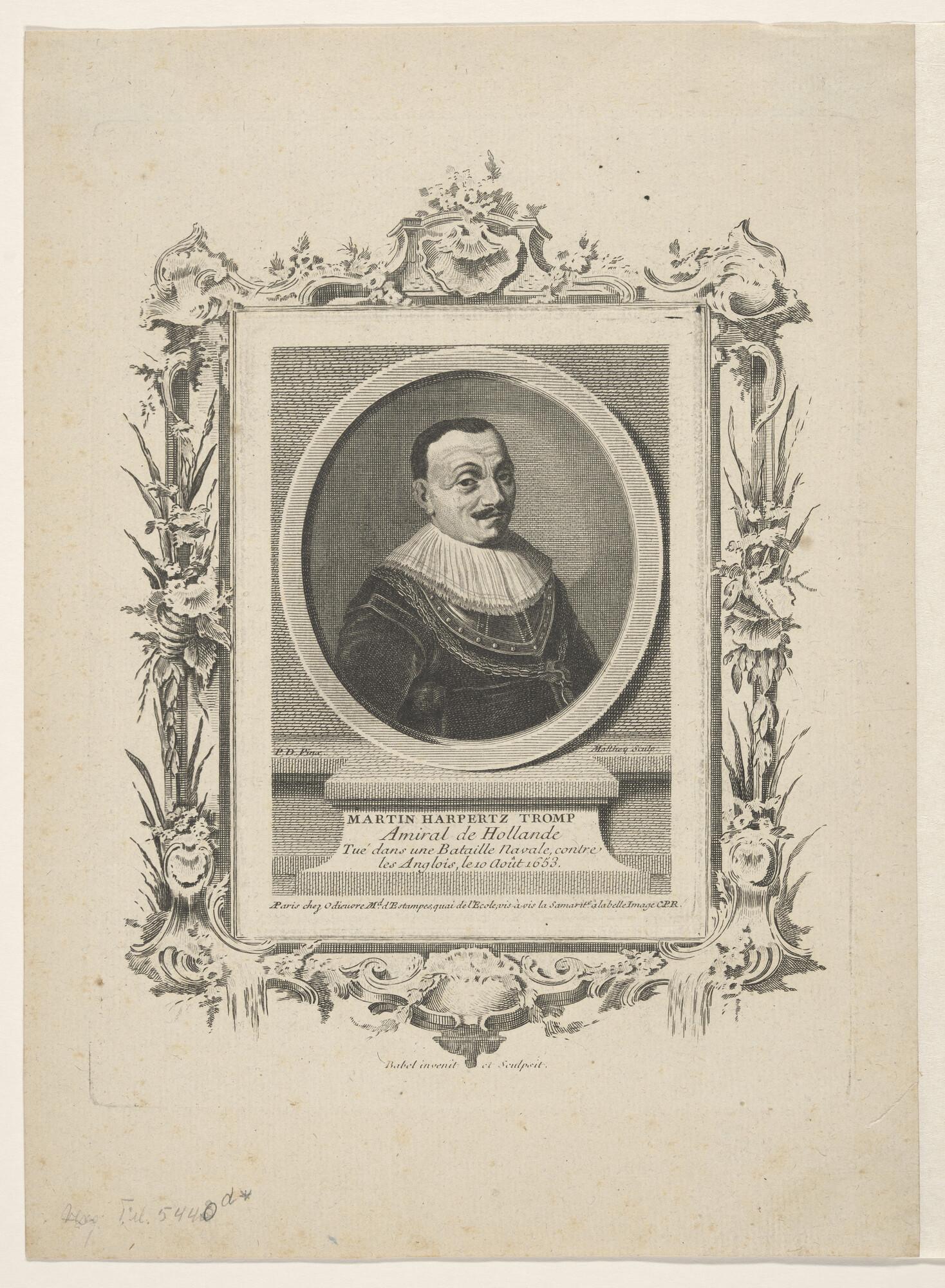Portret van Maarten Harpertsz. Tromp, in ovaal. Met omlijsting in rococo-stijl, uitgegeven in Parijs.
