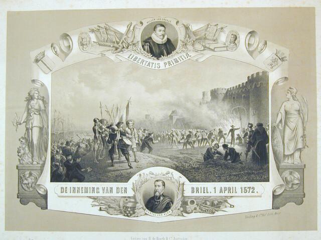 Gedenkplaat op de 300-jarige herdenking van de inname van Den Briel, 1872. Afgebeeld is onder meer de bestorming van de stadspoort door de Watergeuzen. met bijbehorende gedrukte verklaring.