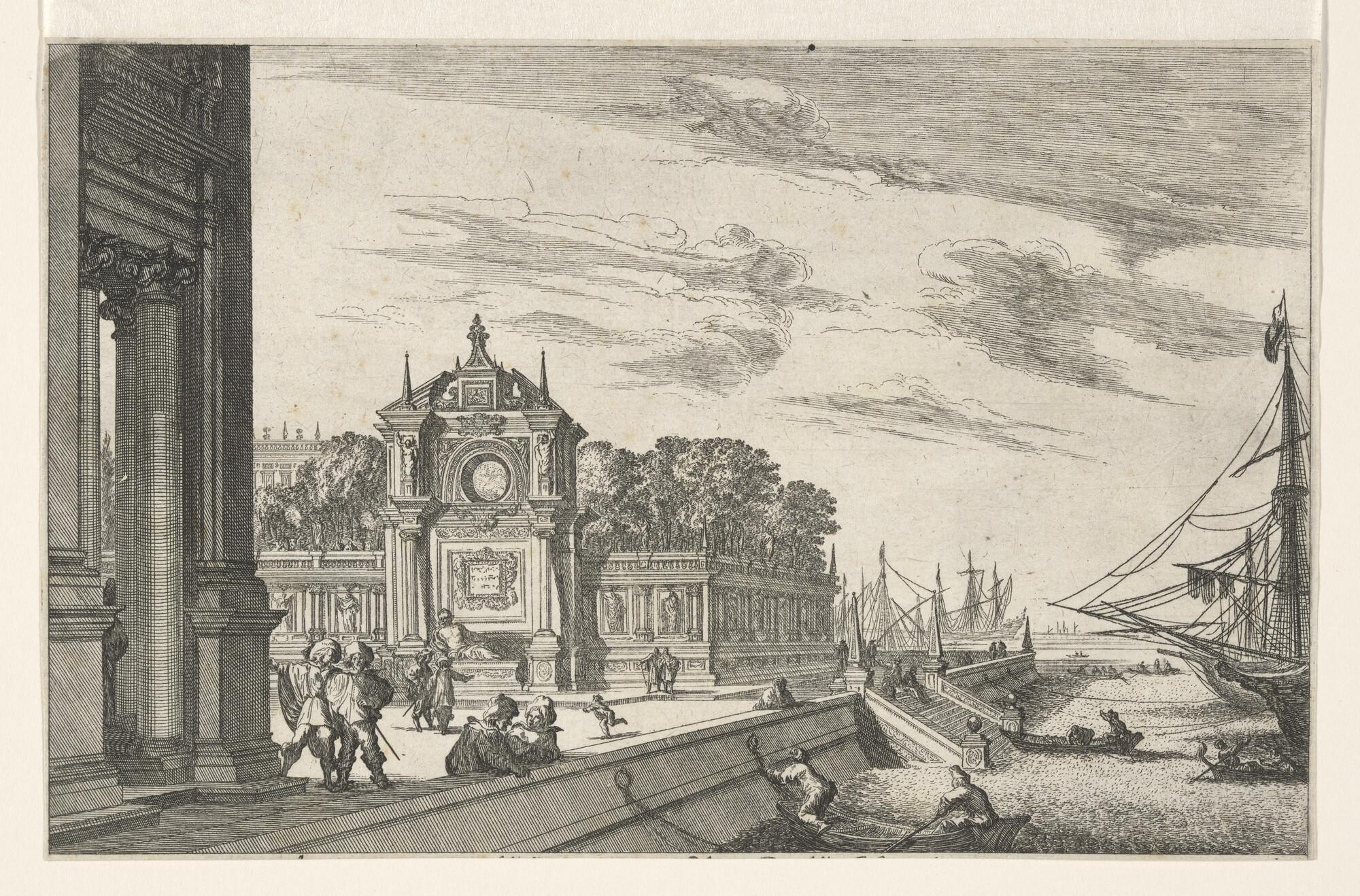 Prent uit een reeks met zeehavens en paleizen in Italië, uit de serie "Underschidliche Meer Porten und Pallazzia von Joh. Willhelm Bauren in Italia nach dem Leben gezeichnet". Links classicistische architectuur en rechts een haven met een kademuur, waarin zich een trap bevindt. Nummer 6 van 12.