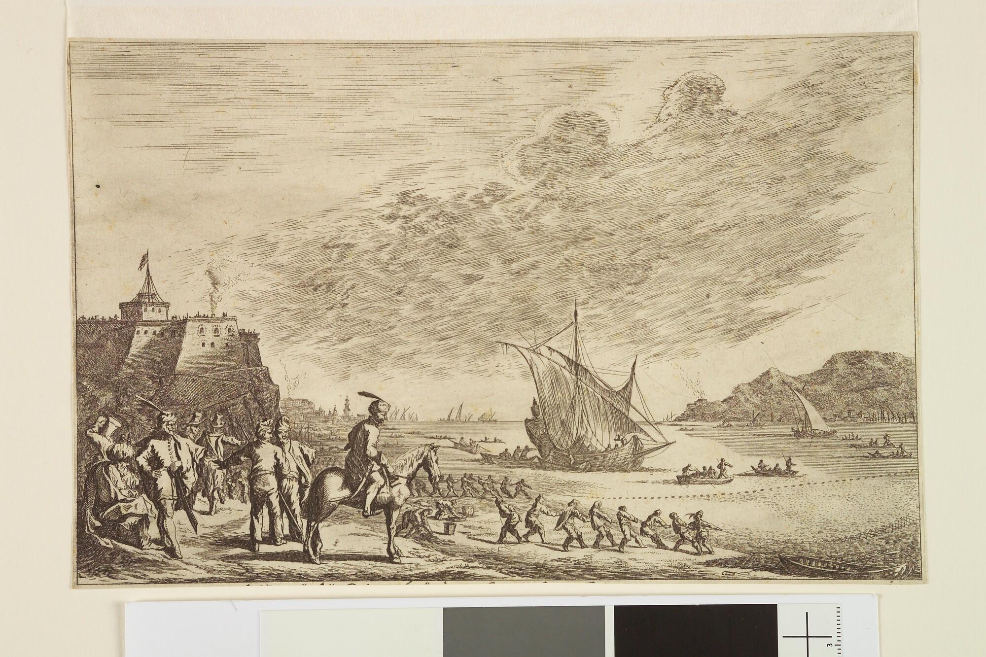 Prent uit een reeks met zeehavens en paleizen in Italië, uit de serie "Underschidliche Meer Porten und Pallazzia von. Joh. Willhelm Bauren in Italia nach dem Leben gezeichnet". Prent van een baai met vissers die op het strand hun netten binnenhalen. Links voor een ruiter, geheel links een fort op een rots. Nummer 9 van ...