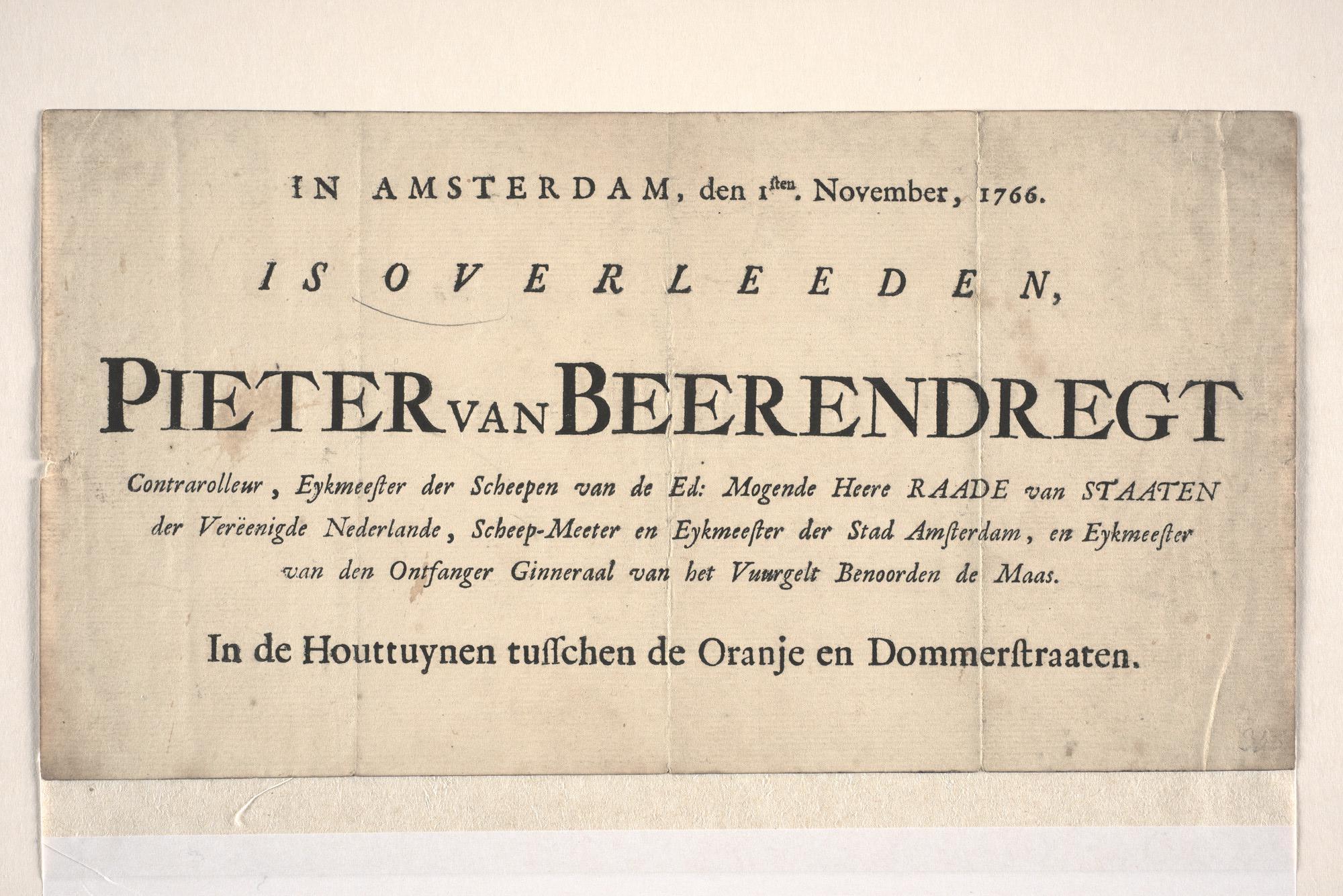 Het overlijdensbericht van Pieter van Berendregt op 1 november 1766